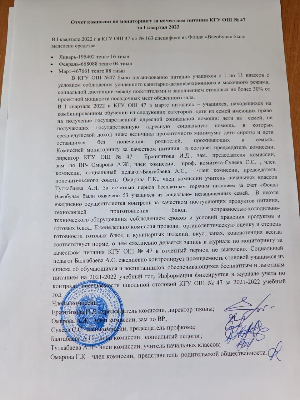 31 март 2022 0 1 2 3 4 5 Отчет комиссии по мониторингу за качеством питания КГУ ОШ №47 за I квартал 2022 год Отчет комиссии по мониторингу за качеством питания КГУ ОШ №47 за I квартал 2022 год