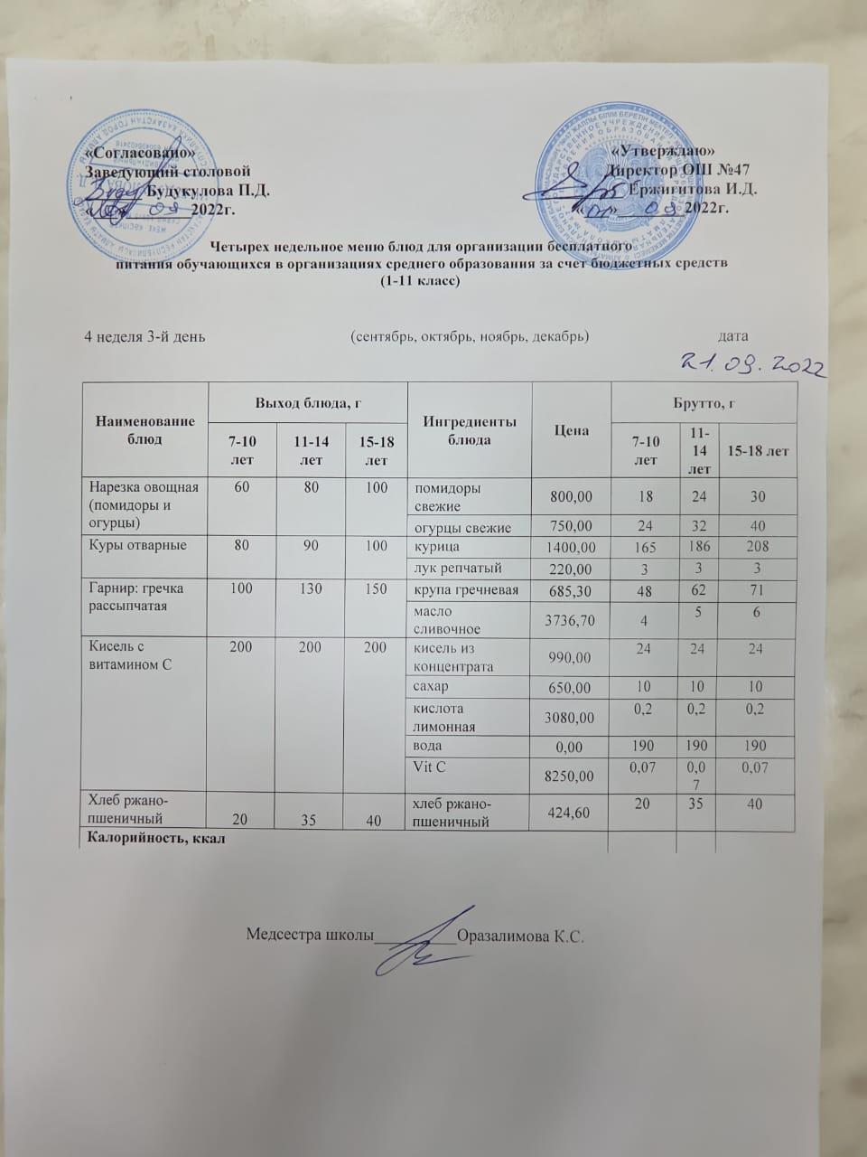 Четырехнедельное меню блюд для организации бесплатного питания обучающихся в организациях среднего образования за счет бюджетных средств