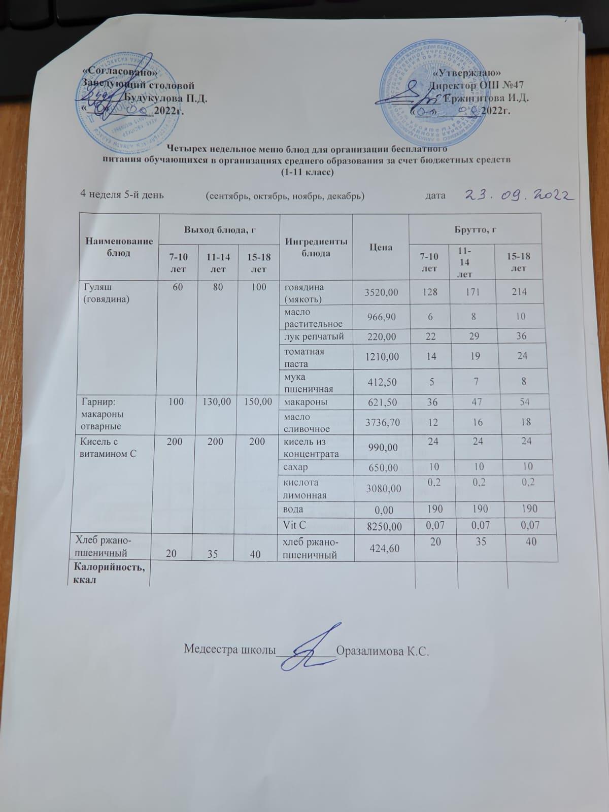 Четырехнедельное меню блюд для организации бесплатного питания обучающихся в организациях среднего образования за счет бюджетных средств