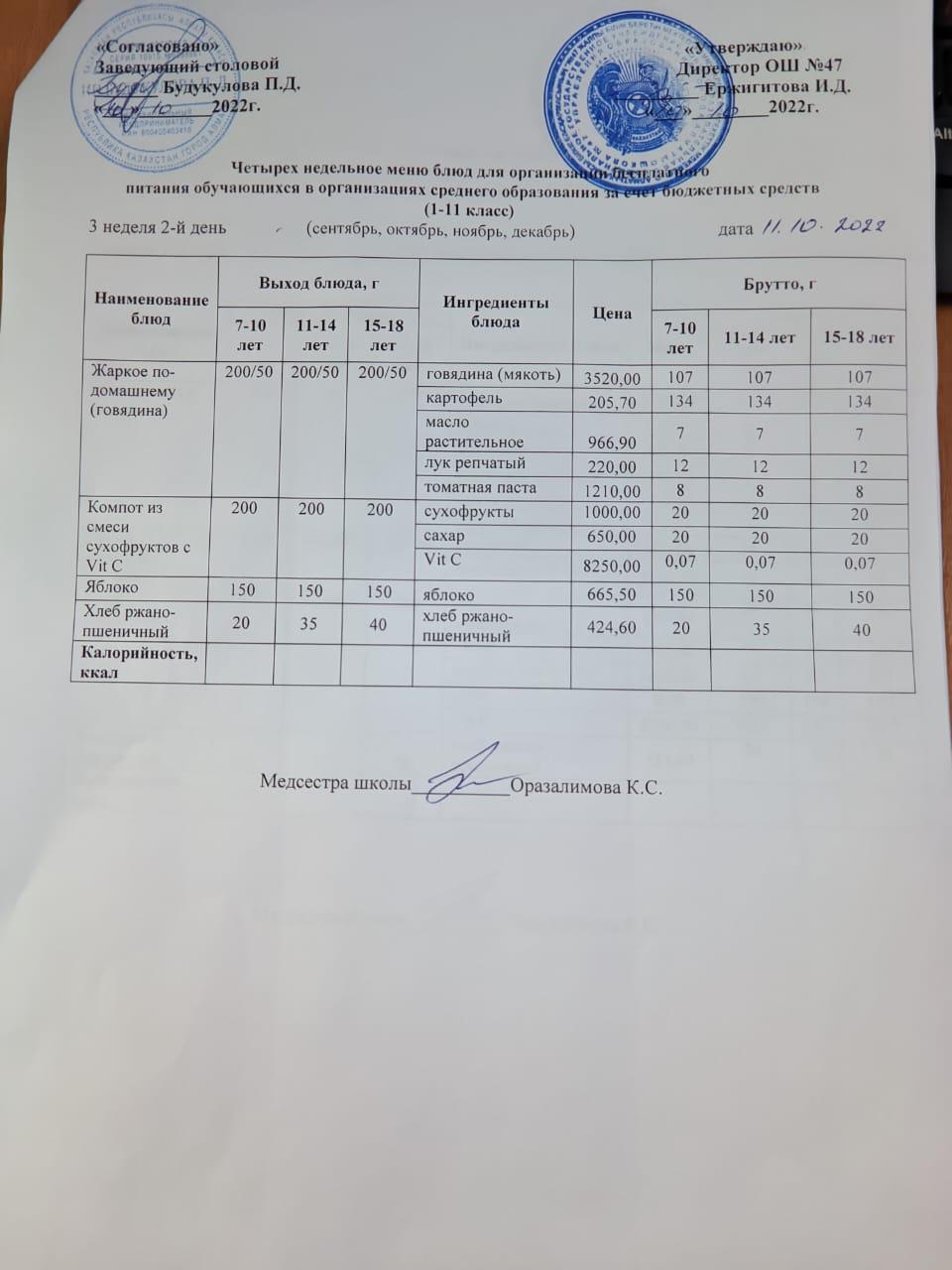 12 сентябрь 2022 Ас мәзірі 3 апта 1-күн