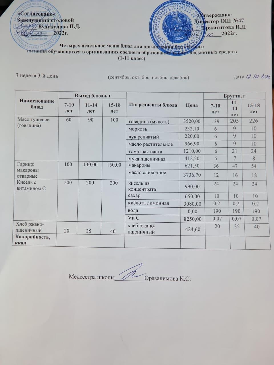 12 сентябрь 2022 Ас мәзірі 3 апта 1-күн