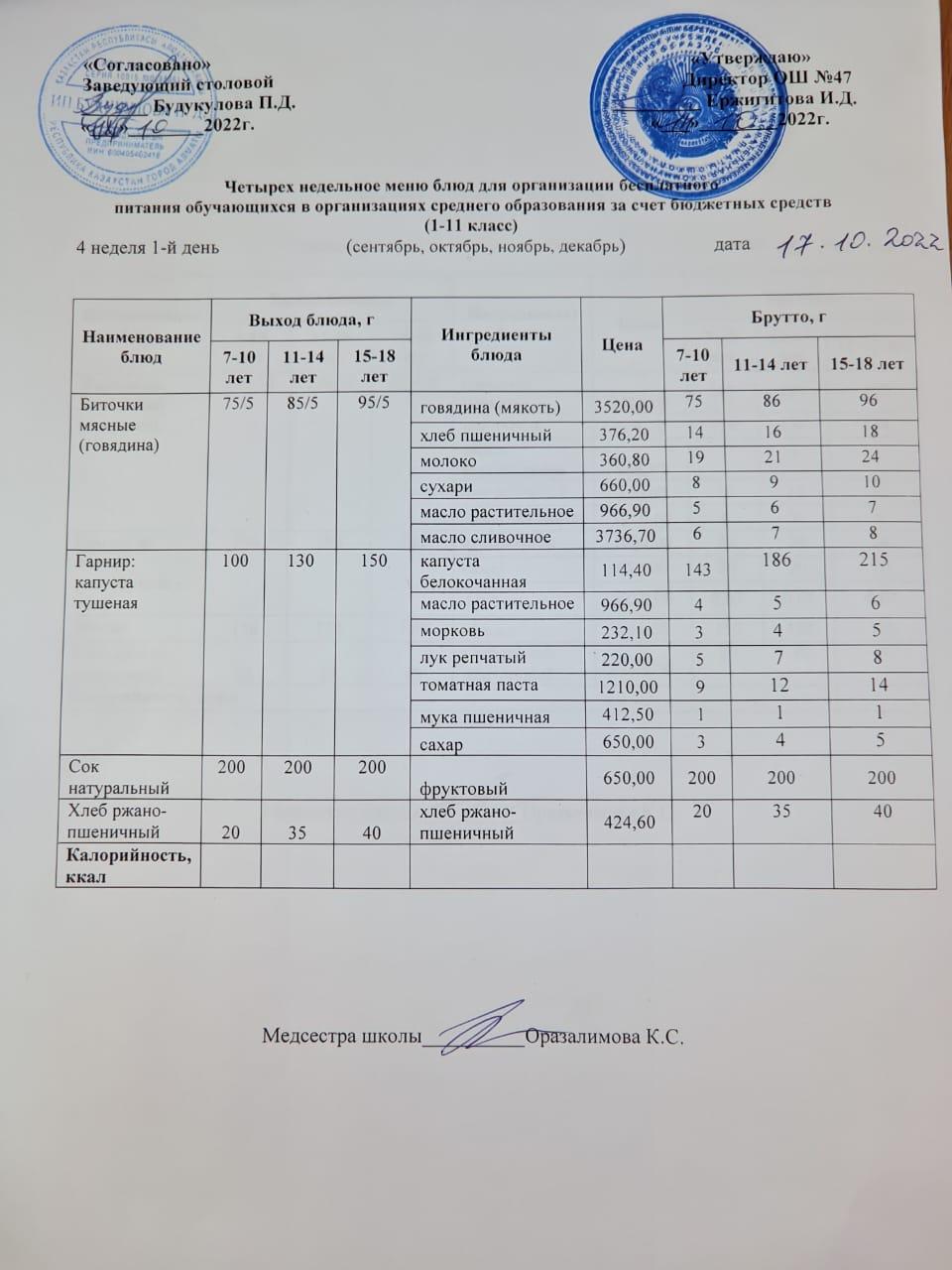 Бюджет қаражаты есебінен орта білім беру ұйымдарында білім алушыларды тегін тамақтандыруды ұйымдастыру үшін төрт апталық ас мәзірі/ Четырехнедельное меню блюд для организации бесплатного питания обучающихся в организациях среднего образования за счет бюджетных средств