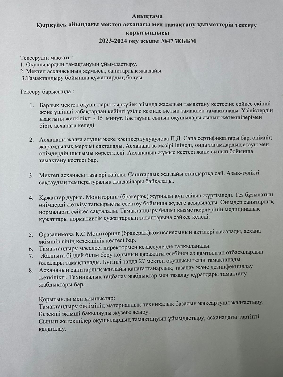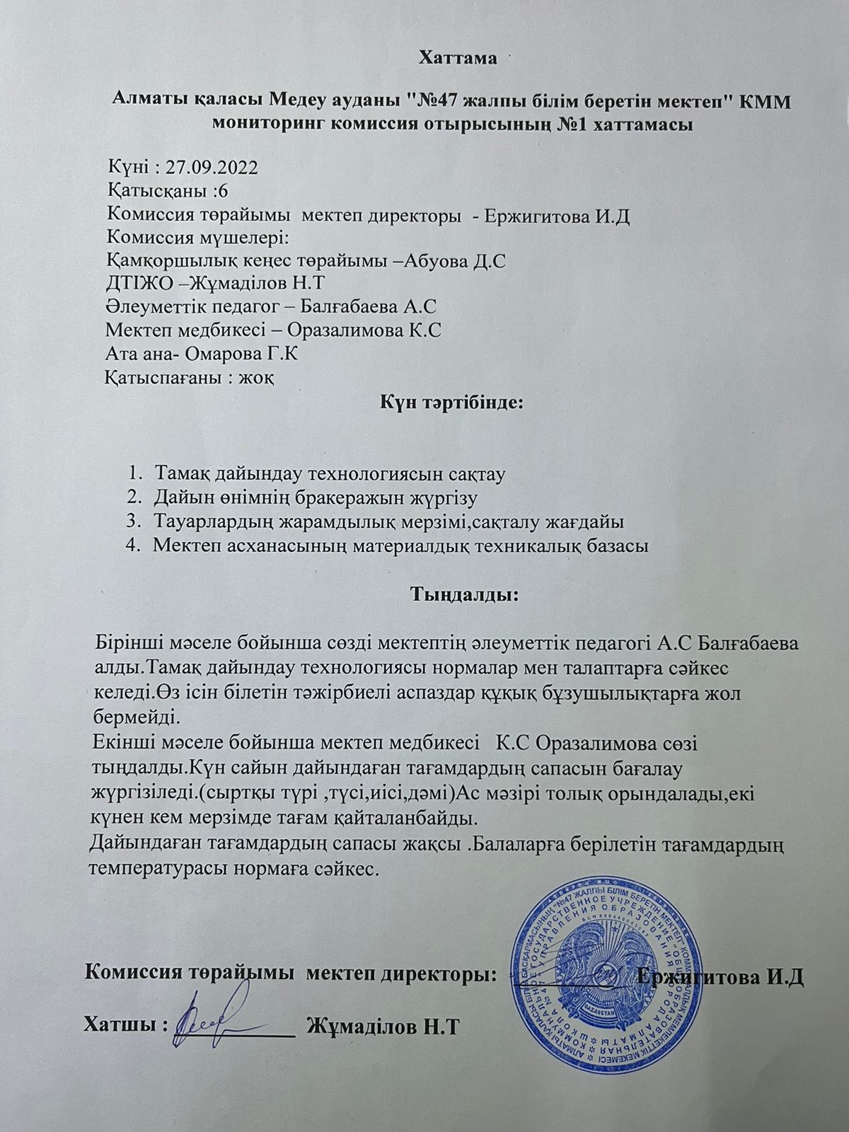 27 сентябрь 2023 0 1 2 3 4 5 Хаттама Алматы қаласы Медеу ауданы "№47 жалпы білім беретін мектеп" КММ мониторинг комиссия отырысының №1 хаттамасы
