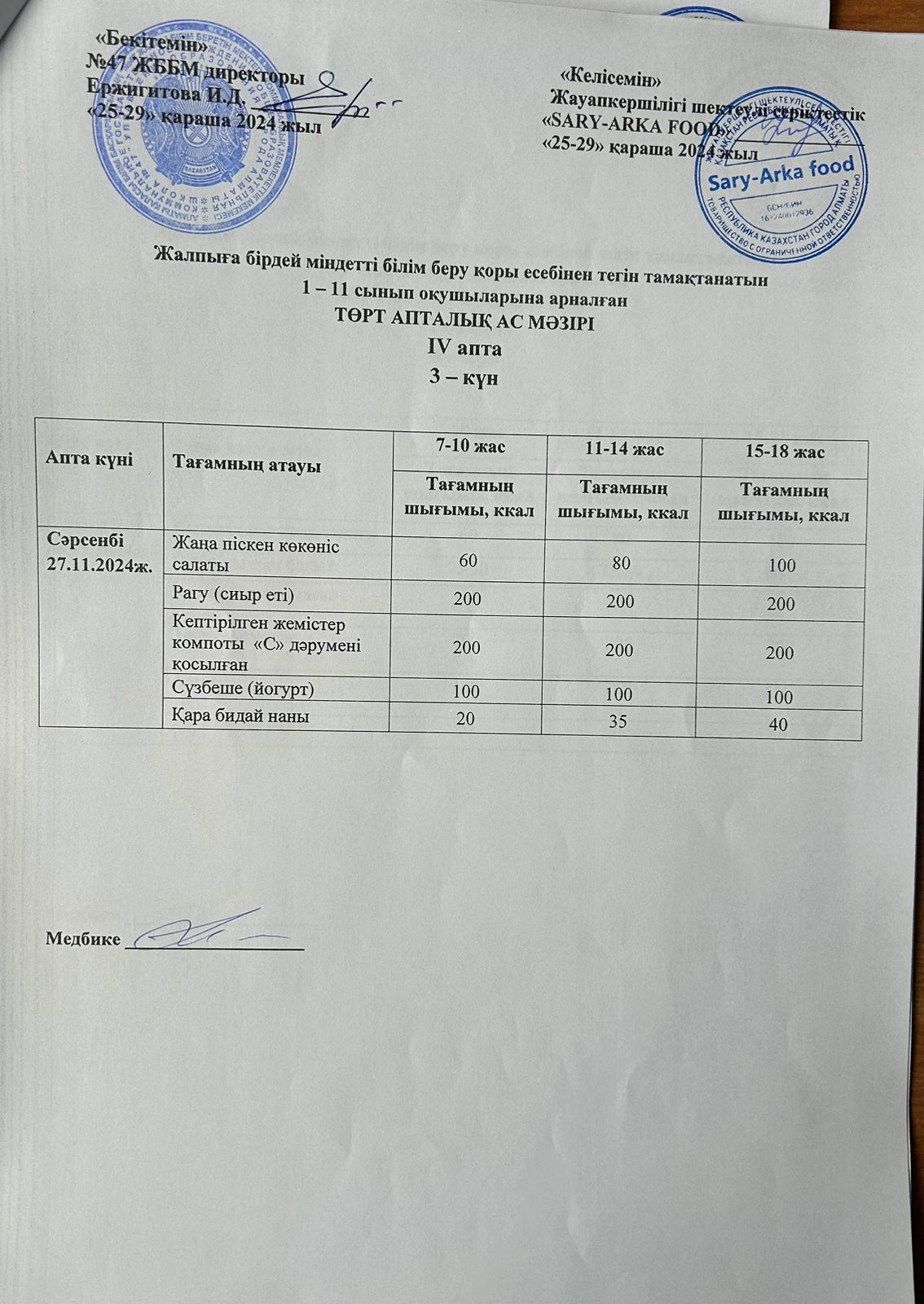 Бюджет қаражаты есебінен орта білім беру ұйымдарында білім алушыларды тегін тамақтандыруды ұйымдастыру үшін төрт апталық ас мәзірі/ Четырехнедельное меню блюд для организации бесплатного питания обучающихся в организациях среднего образования за счет бюджетных средств