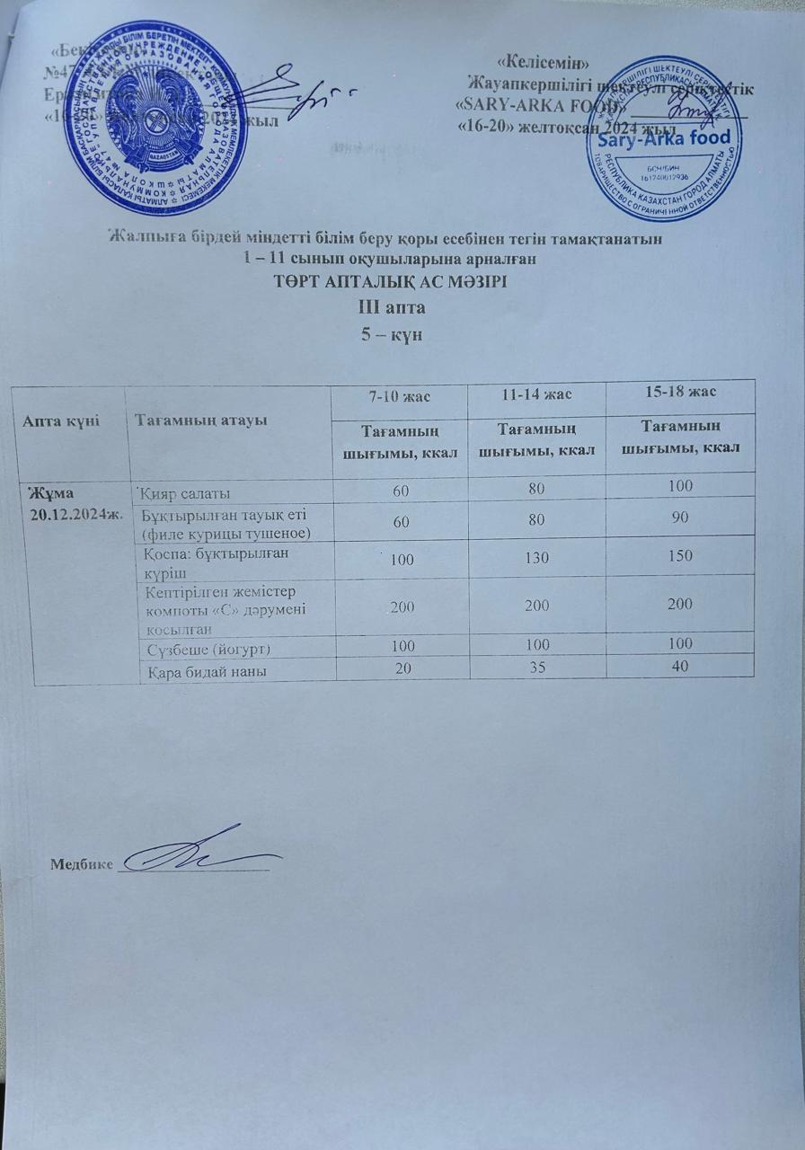 Бюджет қаражаты есебінен орта білім беру ұйымдарында білім алушыларды тегін тамақтандыруды ұйымдастыру үшін төрт апталық ас мәзірі/ Четырехнедельное меню блюд для организации бесплатного питания обучающихся в организациях среднего образования за счет бюджетных средств