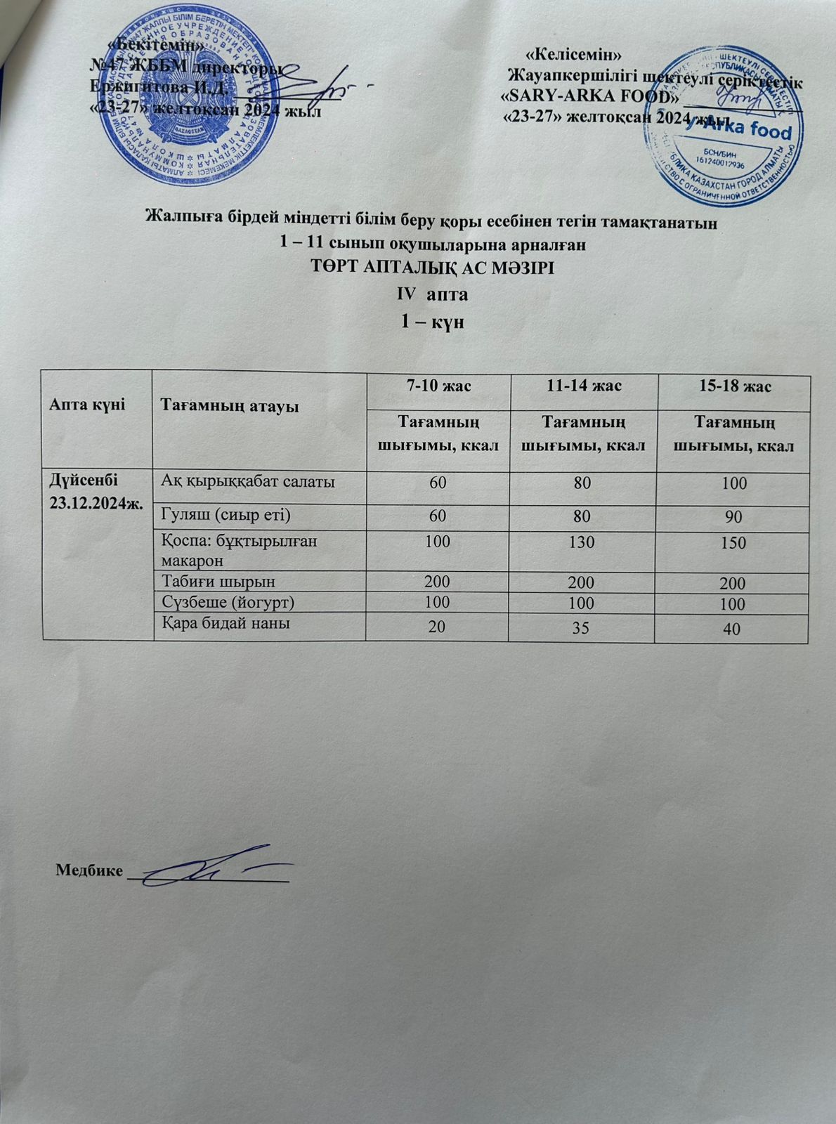 19 сентябрь 2024 Ас мәзірі 1-апта 3-күн