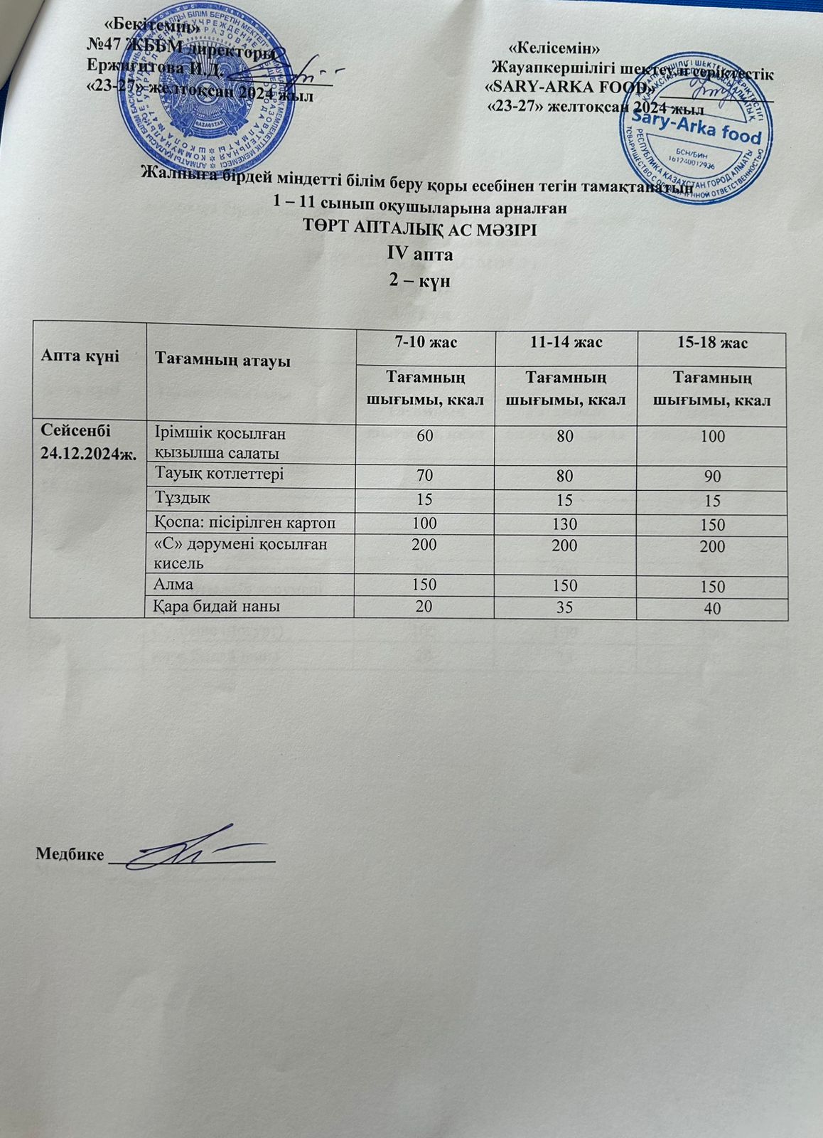 30 сентябрь 2024 Ас мәзірі 1-апта 1-күн