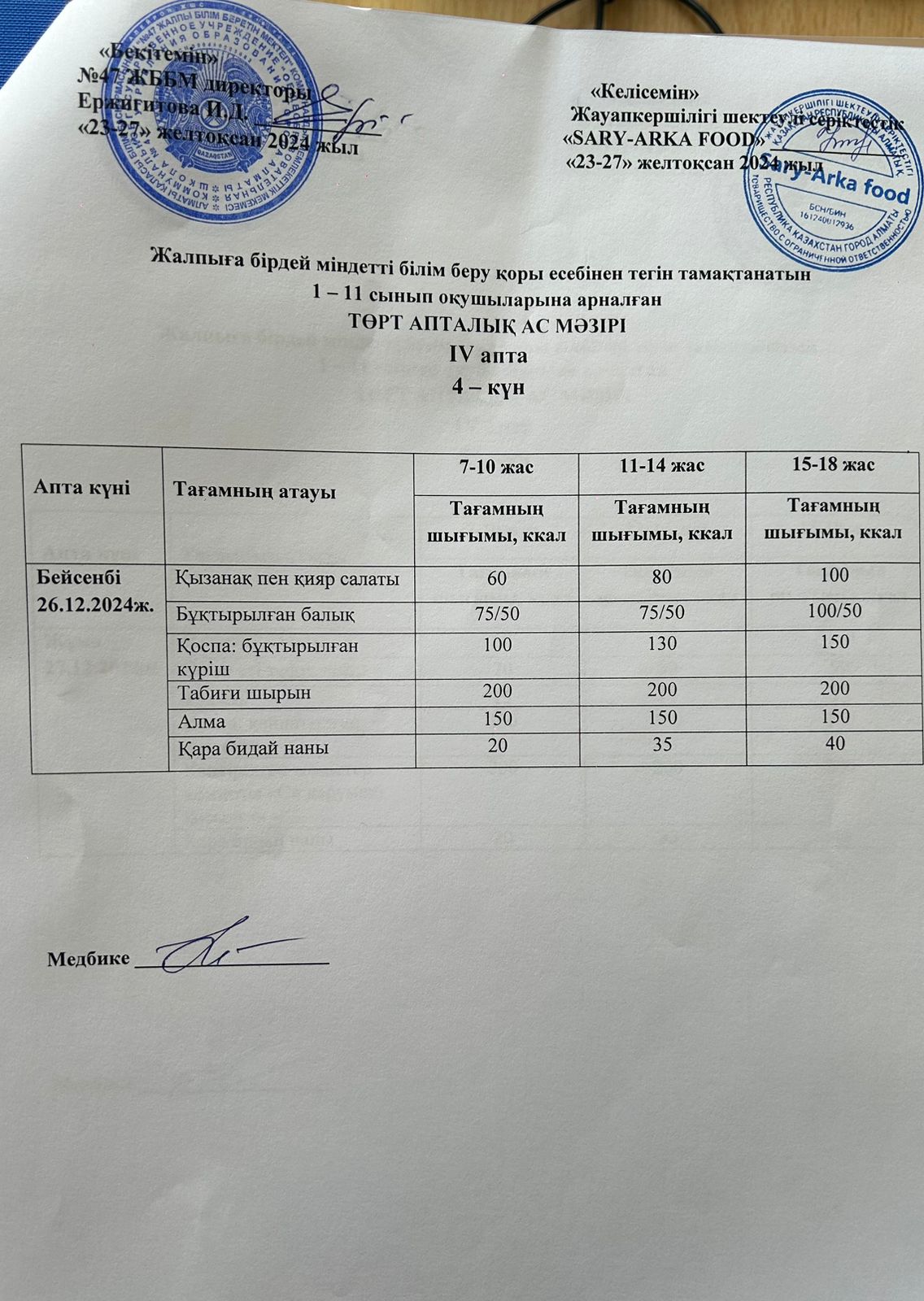 Бюджет қаражаты есебінен орта білім беру ұйымдарында білім алушыларды тегін тамақтандыруды ұйымдастыру үшін төрт апталық ас мәзірі/ Четырехнедельное меню блюд для организации бесплатного питания обучающихся в организациях среднего образования за счет бюджетных средств