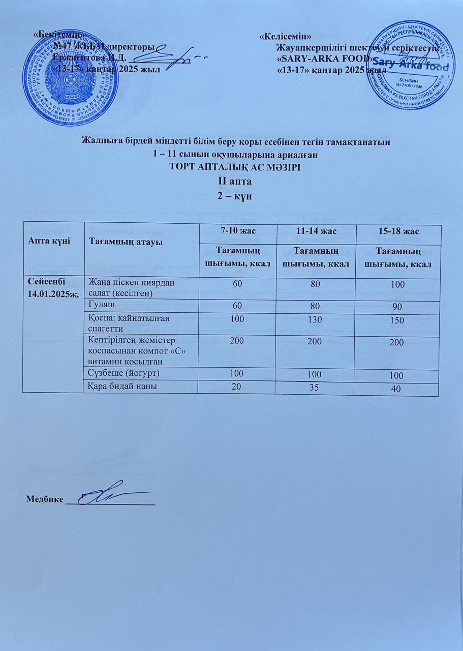 Бюджет қаражаты есебінен орта білім беру ұйымдарында білім алушыларды тегін тамақтандыруды ұйымдастыру үшін төрт апталық ас мәзірі/ Четырехнедельное меню блюд для организации бесплатного питания обучающихся в организациях среднего образования за счет бюджетных средств