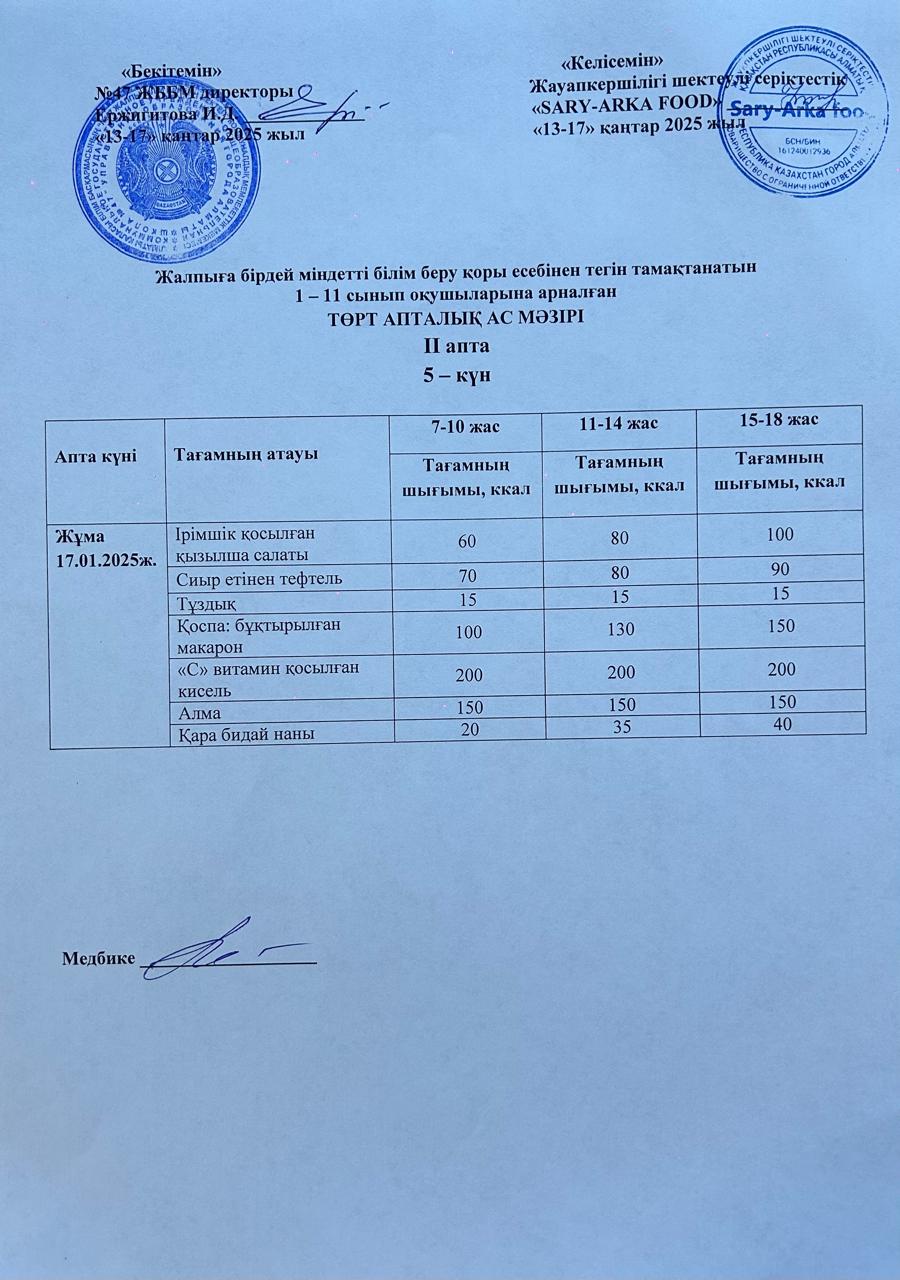 Бюджет қаражаты есебінен орта білім беру ұйымдарында білім алушыларды тегін тамақтандыруды ұйымдастыру үшін төрт апталық ас мәзірі/ Четырехнедельное меню блюд для организации бесплатного питания обучающихся в организациях среднего образования за счет бюджетных средств
