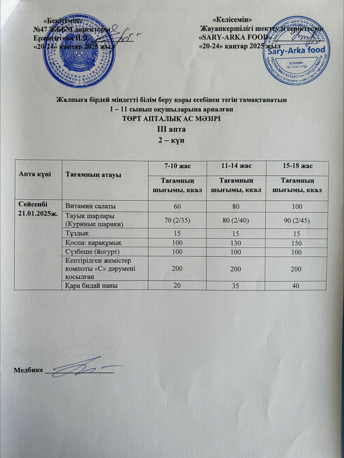 Бюджет қаражаты есебінен орта білім беру ұйымдарында білім алушыларды тегін тамақтандыруды ұйымдастыру үшін төрт апталық ас мәзірі/ Четырехнедельное меню блюд для организации бесплатного питания обучающихся в организациях среднего образования за счет бюджетных средств