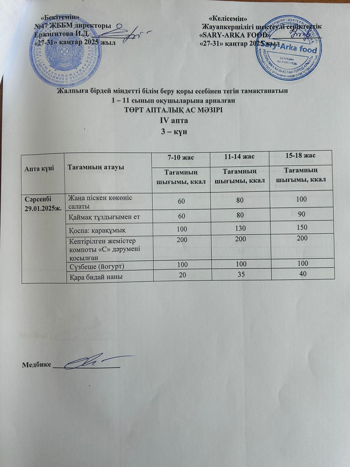 Бюджет қаражаты есебінен орта білім беру ұйымдарында білім алушыларды тегін тамақтандыруды ұйымдастыру үшін төрт апталық ас мәзірі/ Четырехнедельное меню блюд для организации бесплатного питания обучающихся в организациях среднего образования за счет бюджетных средств