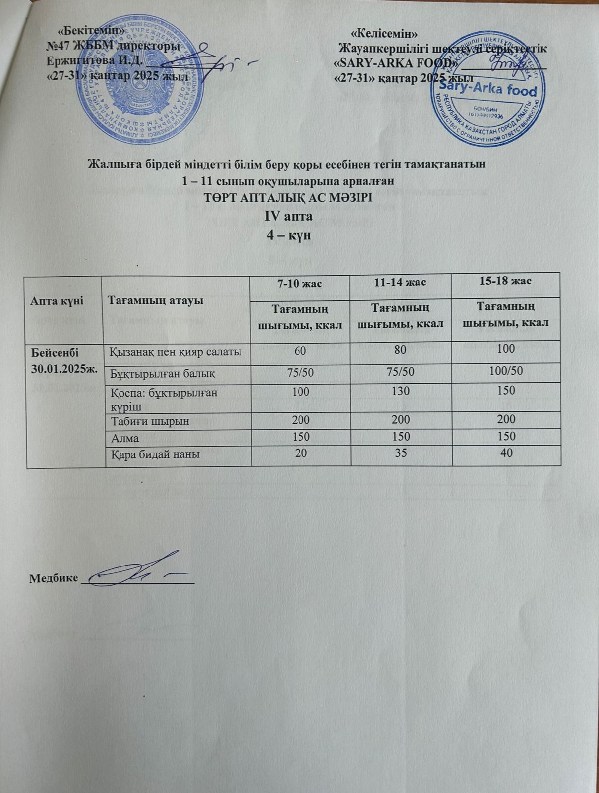 Бюджет қаражаты есебінен орта білім беру ұйымдарында білім алушыларды тегін тамақтандыруды ұйымдастыру үшін төрт апталық ас мәзірі/ Четырехнедельное меню блюд для организации бесплатного питания обучающихся в организациях среднего образования за счет бюджетных средств