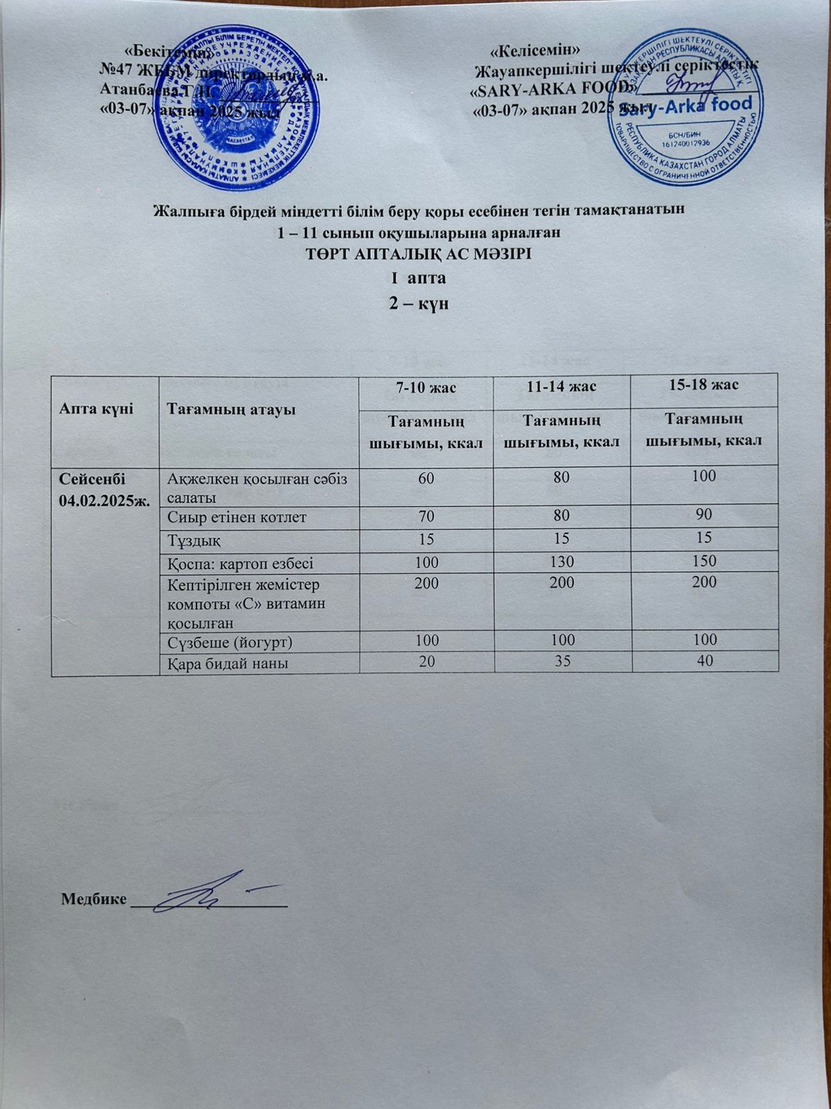 Бюджет қаражаты есебінен орта білім беру ұйымдарында білім алушыларды тегін тамақтандыруды ұйымдастыру үшін төрт апталық ас мәзірі/ Четырехнедельное меню блюд для организации бесплатного питания обучающихся в организациях среднего образования за счет бюджетных средств