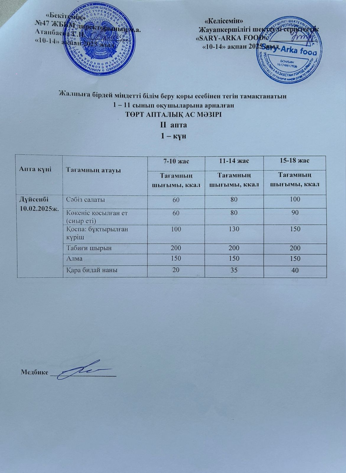Бюджет қаражаты есебінен орта білім беру ұйымдарында білім алушыларды тегін тамақтандыруды ұйымдастыру үшін төрт апталық ас мәзірі/ Четырехнедельное меню блюд для организации бесплатного питания обучающихся в организациях среднего образования за счет бюджетных средств