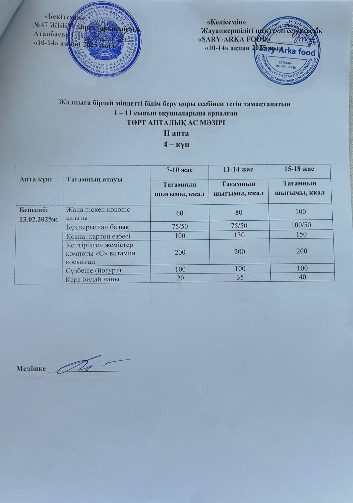 Бюджет қаражаты есебінен орта білім беру ұйымдарында білім алушыларды тегін тамақтандыруды ұйымдастыру үшін төрт апталық ас мәзірі/ Четырехнедельное меню блюд для организации бесплатного питания обучающихся в организациях среднего образования за счет бюджетных средств