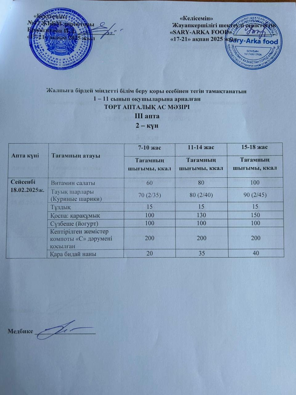 Бюджет қаражаты есебінен орта білім беру ұйымдарында білім алушыларды тегін тамақтандыруды ұйымдастыру үшін төрт апталық ас мәзірі/ Четырехнедельное меню блюд для организации бесплатного питания обучающихся в организациях среднего образования за счет бюджетных средств
