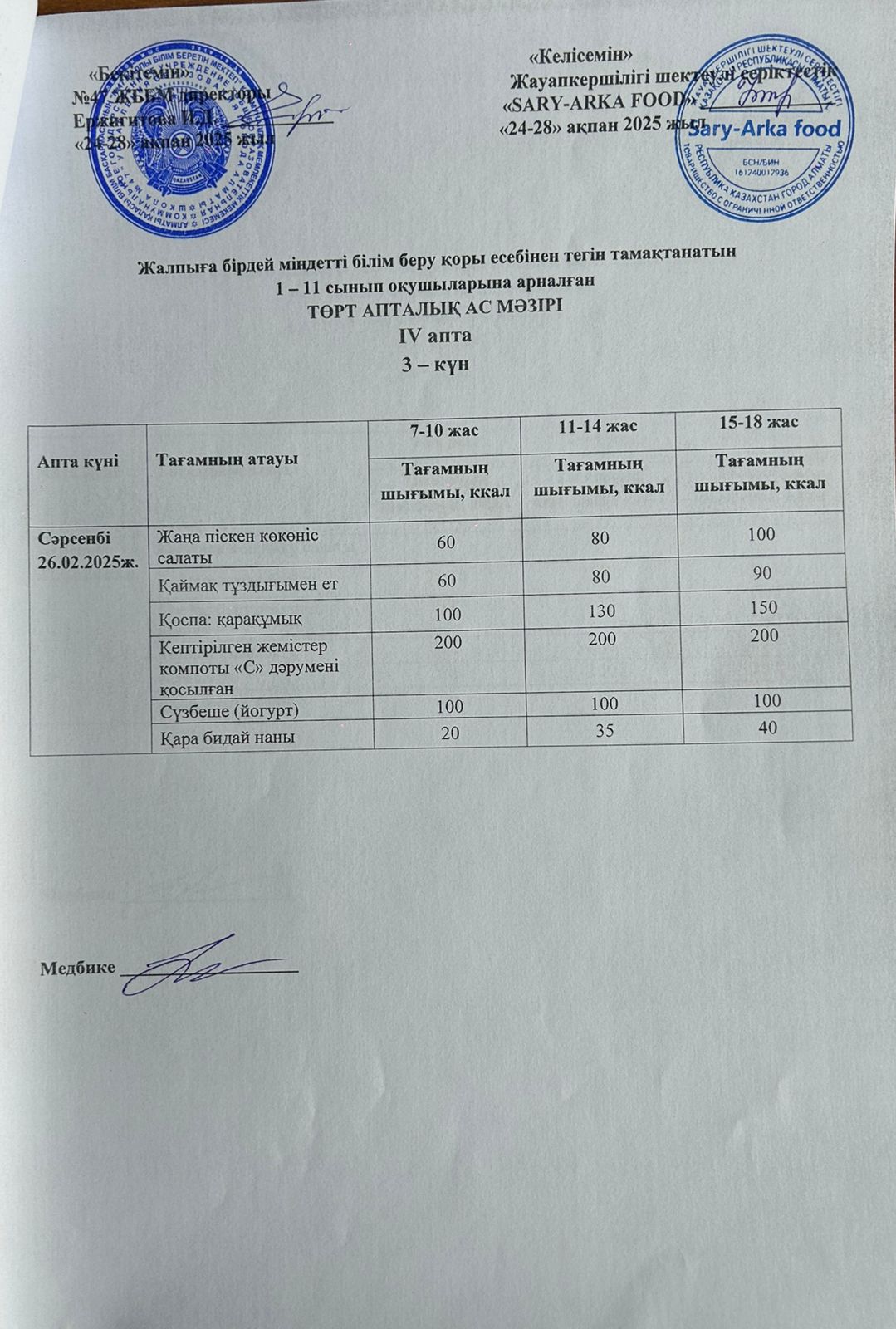 Бюджет қаражаты есебінен орта білім беру ұйымдарында білім алушыларды тегін тамақтандыруды ұйымдастыру үшін төрт апталық ас мәзірі/ Четырехнедельное меню блюд для организации бесплатного питания обучающихся в организациях среднего образования за счет бюджетных средств