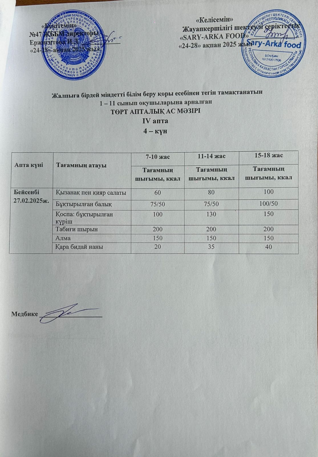 Бюджет қаражаты есебінен орта білім беру ұйымдарында білім алушыларды тегін тамақтандыруды ұйымдастыру үшін төрт апталық ас мәзірі/ Четырехнедельное меню блюд для организации бесплатного питания обучающихся в организациях среднего образования за счет бюджетных средств