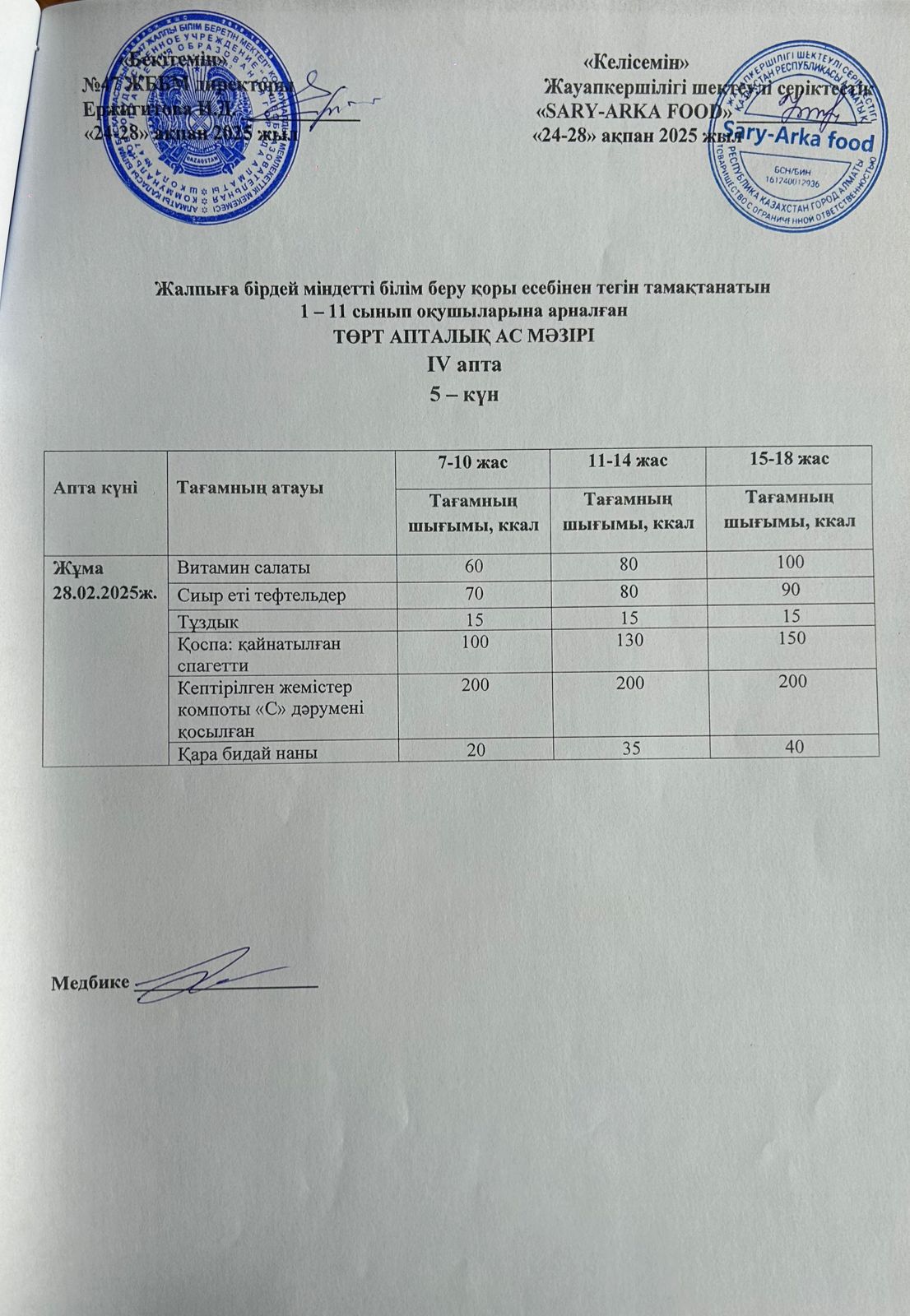 Бюджет қаражаты есебінен орта білім беру ұйымдарында білім алушыларды тегін тамақтандыруды ұйымдастыру үшін төрт апталық ас мәзірі/ Четырехнедельное меню блюд для организации бесплатного питания обучающихся в организациях среднего образования за счет бюджетных сре