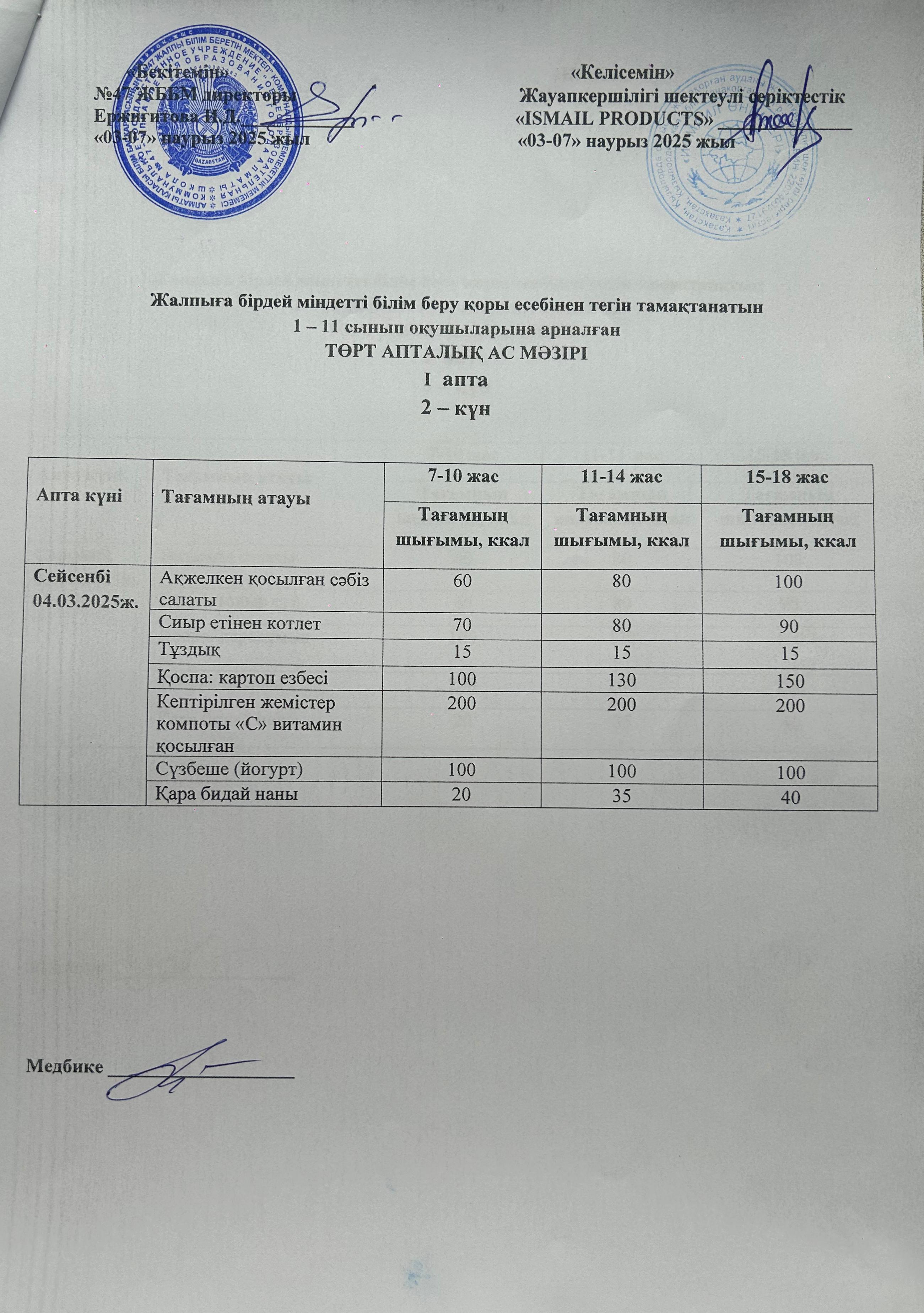 Бюджет қаражаты есебінен орта білім беру ұйымдарында білім алушыларды тегін тамақтандыруды ұйымдастыру үшін төрт апталық ас мәзірі/ Четырехнедельное меню блюд для организации бесплатного питания обучающихся в организациях среднего образования за счет бюджетных средств