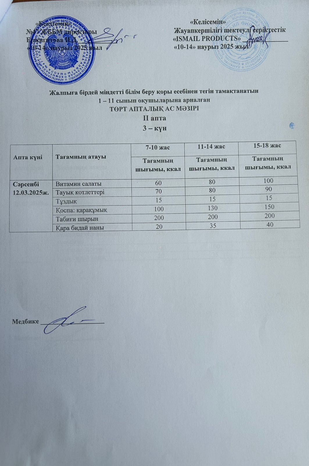Бюджет қаражаты есебінен орта білім беру ұйымдарында білім алушыларды тегін тамақтандыруды ұйымдастыру үшін төрт апталық ас мәзірі/ Четырехнедельное меню блюд для организации бесплатного питания обучающихся в организациях среднего образования за счет бюджетных средств
