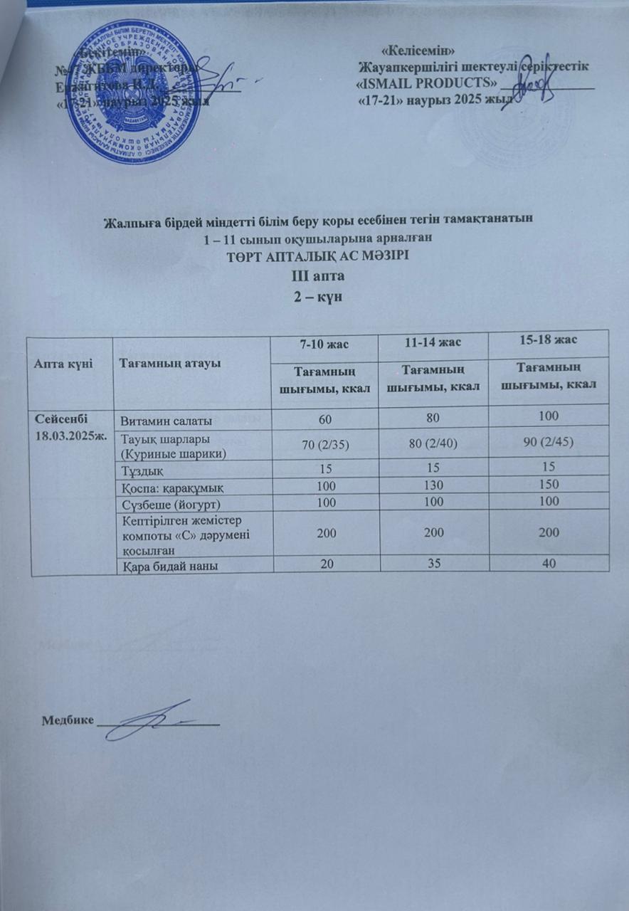 Бюджет қаражаты есебінен орта білім беру ұйымдарында білім алушыларды тегін тамақтандыруды ұйымдастыру үшін төрт апталық ас мәзірі/ Четырехнедельное меню блюд для организации бесплатного питания обучающихся в организациях среднего образования за счет бюджетных средств