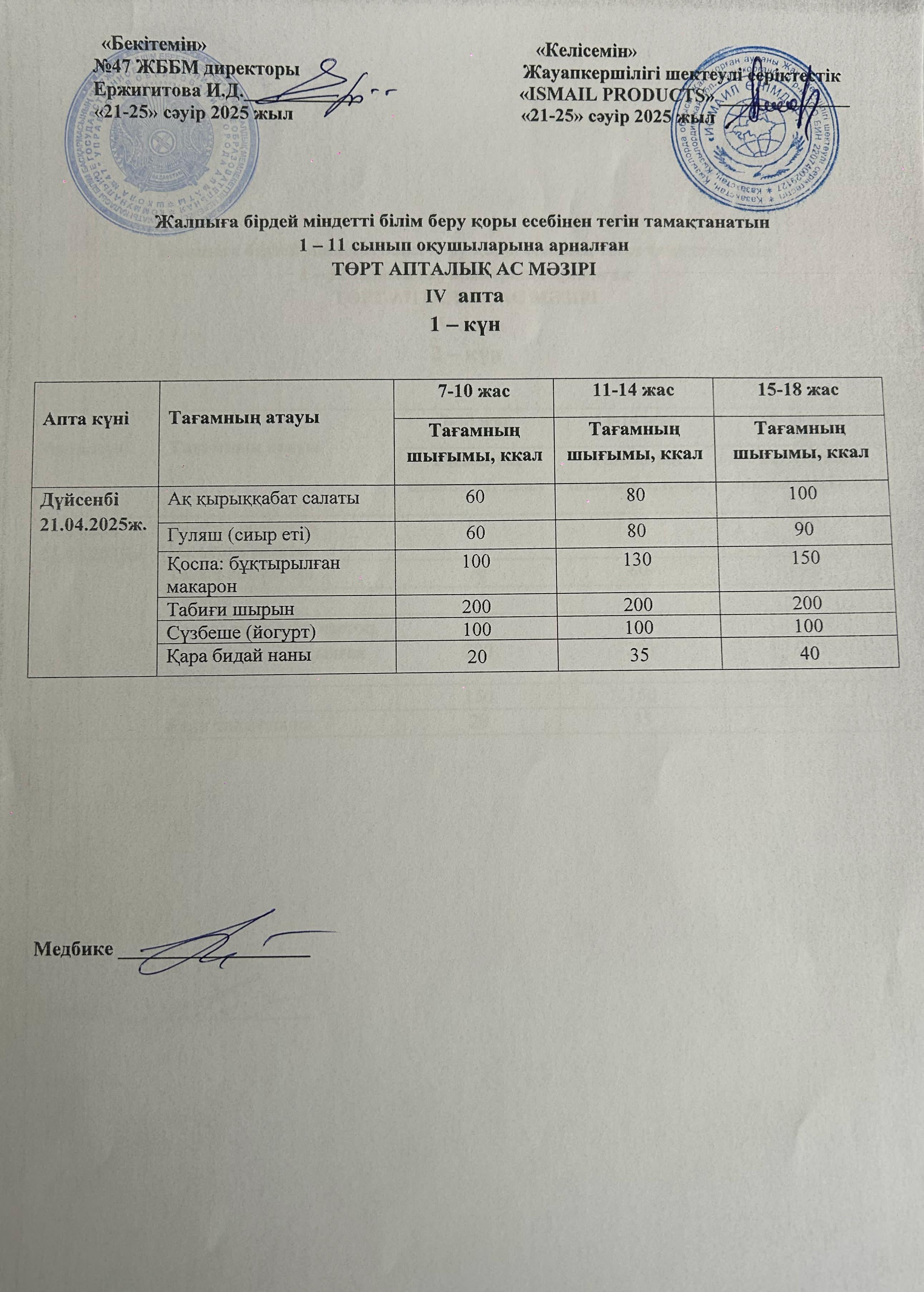 Бюджет қаражаты есебінен орта білім беру ұйымдарында білім алушыларды тегін тамақтандыруды ұйымдастыру үшін төрт апталық ас мәзірі/ Четырехнедельное меню блюд для организации бесплатного питания обучающихся в организациях среднего образования за счет бюджетных средств