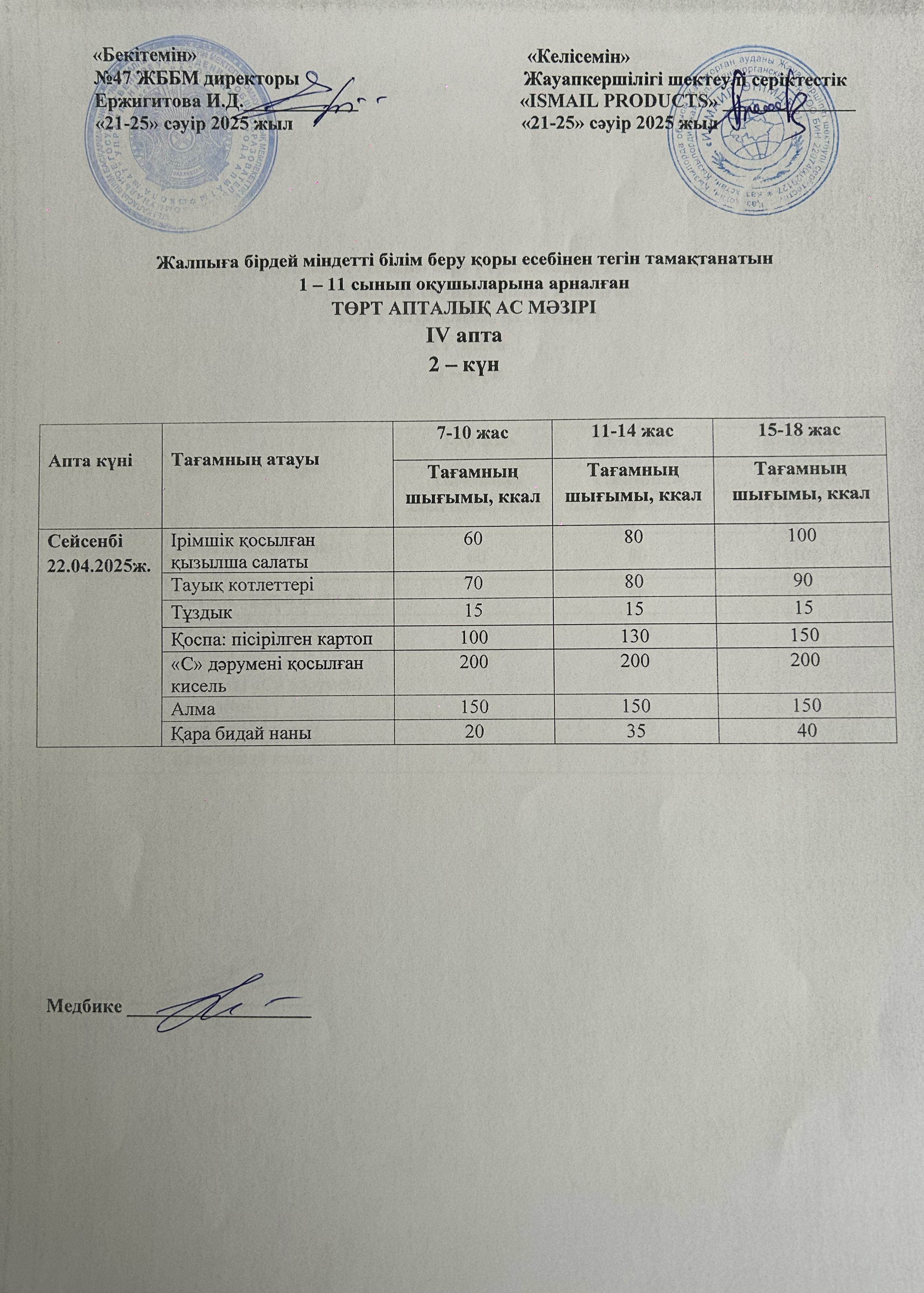 Бюджет қаражаты есебінен орта білім беру ұйымдарында білім алушыларды тегін тамақтандыруды ұйымдастыру үшін төрт апталық ас мәзірі/ Четырехнедельное меню блюд для организации бесплатного питания обучающихся в организациях среднего образования за счет бюджетных средств