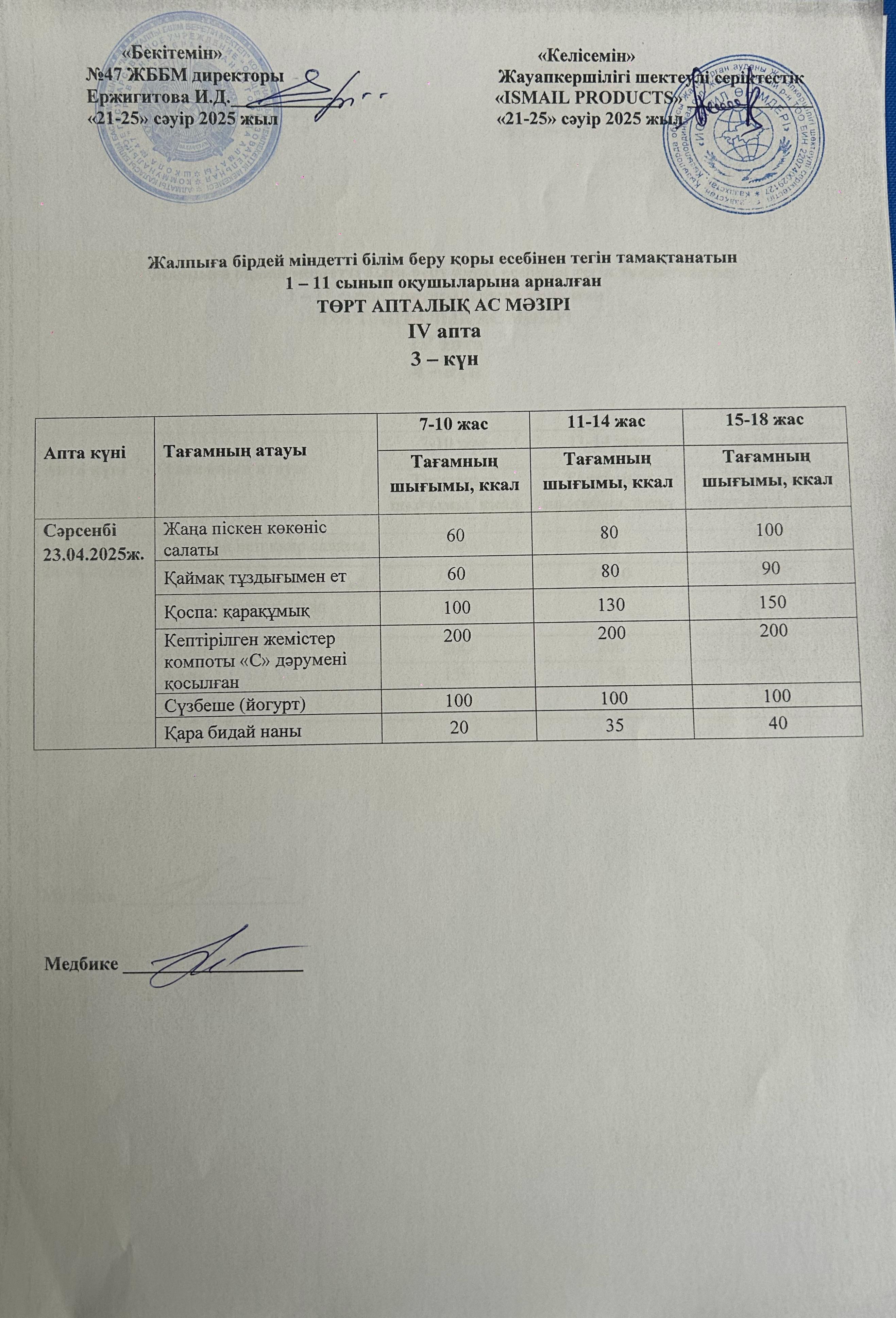 Бюджет қаражаты есебінен орта білім беру ұйымдарында білім алушыларды тегін тамақтандыруды ұйымдастыру үшін төрт апталық ас мәзірі/ Четырехнедельное меню блюд для организации бесплатного питания обучающихся в организациях среднего образования за счет бюджетных средств