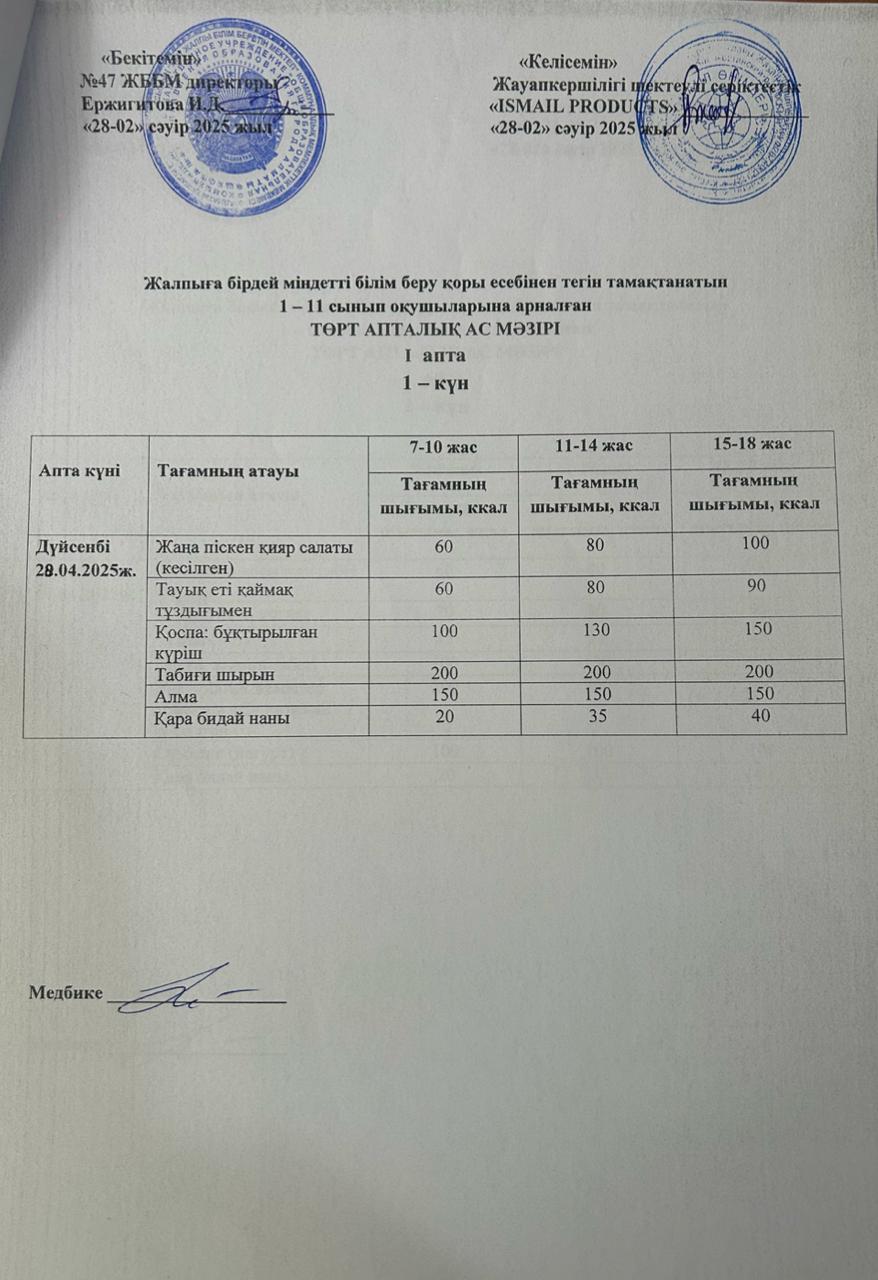 Ас мәзірі 1-апта 1-күн