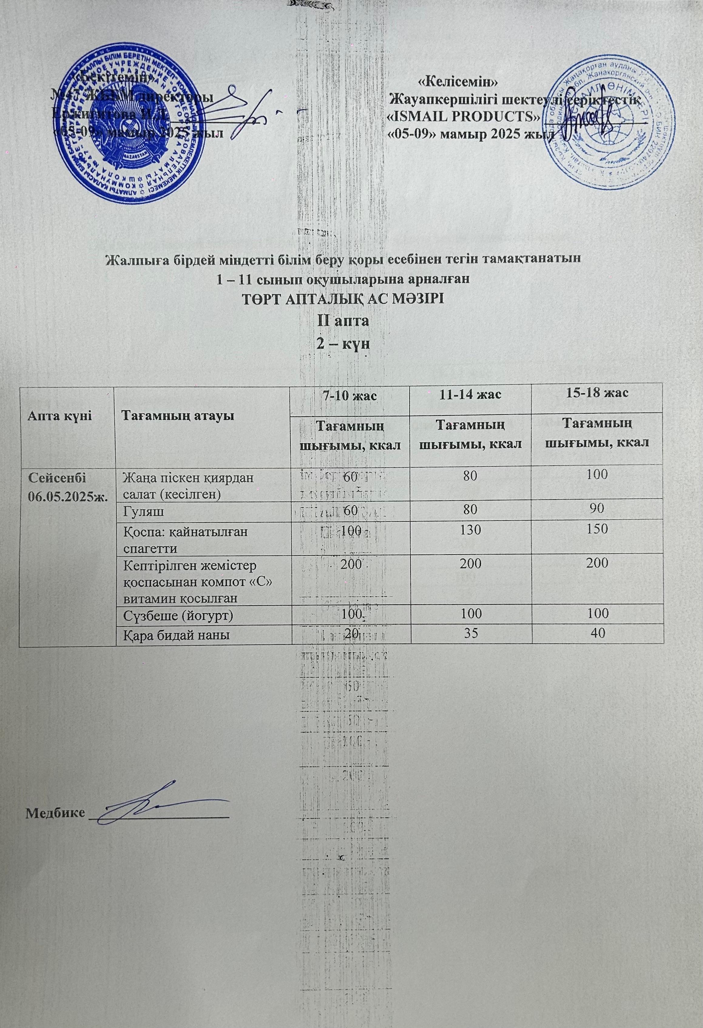 Бюджет қаражаты есебінен орта білім беру ұйымдарында білім алушыларды тегін тамақтандыруды ұйымдастыру үшін төрт апталық ас мәзірі/ Четырехнедельное меню блюд для организации бесплатного питания обучающихся в организациях среднего образования за счет бюджетных средств