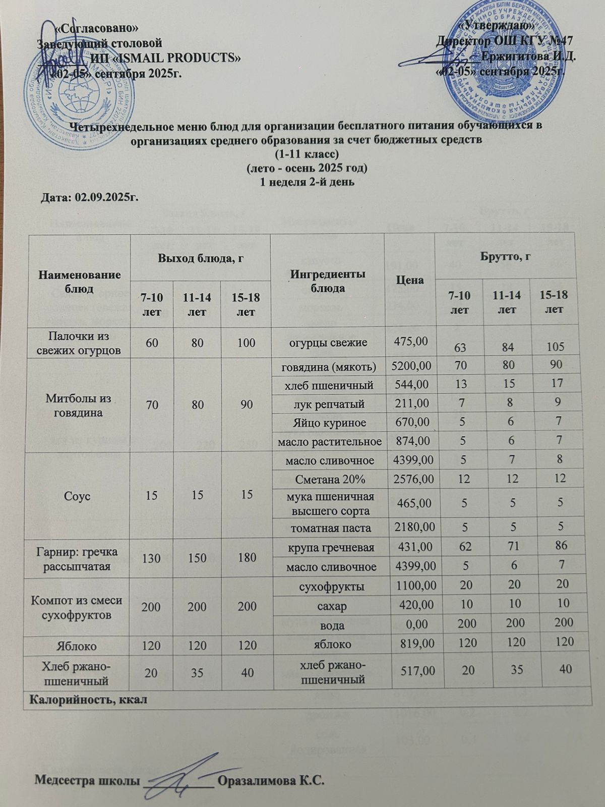 Бюджет қаражаты есебінен орта білім беру ұйымдарында білім алушыларды тегін тамақтандыруды ұйымдастыру үшін төрт апталық ас мәзірі/ Четырехнедельное меню блюд для организации бесплатного питания обучающихся в организациях среднего образования за счет бюджетных средств
