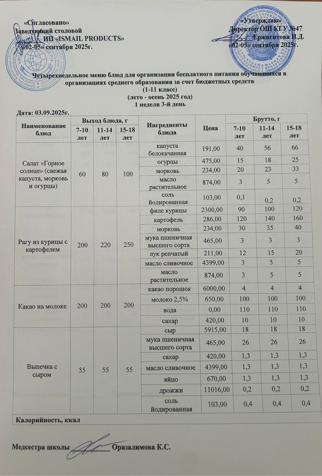Бюджет қаражаты есебінен орта білім беру ұйымдарында білім алушыларды тегін тамақтандыруды ұйымдастыру үшін төрт апталық ас мәзірі/ Четырехнедельное меню блюд для организации бесплатного питания обучающихся в организациях среднего образования за счет бюджетных средств