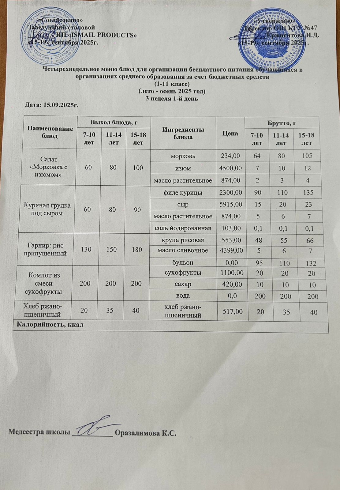 Бюджет қаражаты есебінен орта білім беру ұйымдарында білім алушыларды тегін тамақтандыруды ұйымдастыру үшін төрт апталық ас мәзірі/ Четырехнедельное меню блюд для организации бесплатного питания обучающихся в организациях среднего образования за счет бюджетных средств