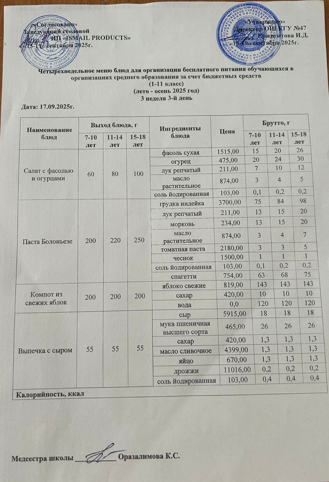Бюджет қаражаты есебінен орта білім беру ұйымдарында білім алушыларды тегін тамақтандыруды ұйымдастыру үшін төрт апталық ас мәзірі/ Четырехнедельное меню блюд для организации бесплатного питания обучающихся в организациях среднего образования за счет бюджетных средств