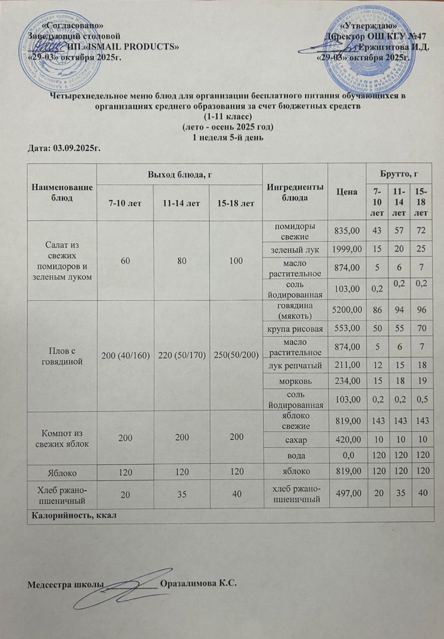 Бюджет қаражаты есебінен орта білім беру ұйымдарында білім алушыларды тегін тамақтандыруды ұйымдастыру үшін төрт апталық ас мәзірі/ Четырехнедельное меню блюд для организации бесплатного питания обучающихся в организациях среднего образования за счет бюджетных средств