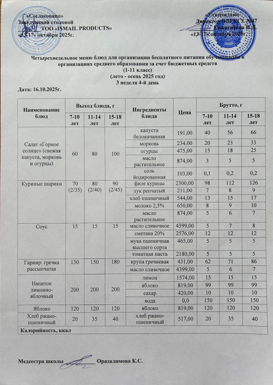 Бюджет қаражаты есебінен орта білім беру ұйымдарында білім алушыларды тегін тамақтандыруды ұйымдастыру үшін төрт апталық ас мәзірі/ Четырехнедельное меню блюд для организации бесплатного питания обучающихся в организациях среднего образования за счет бюджетных средств