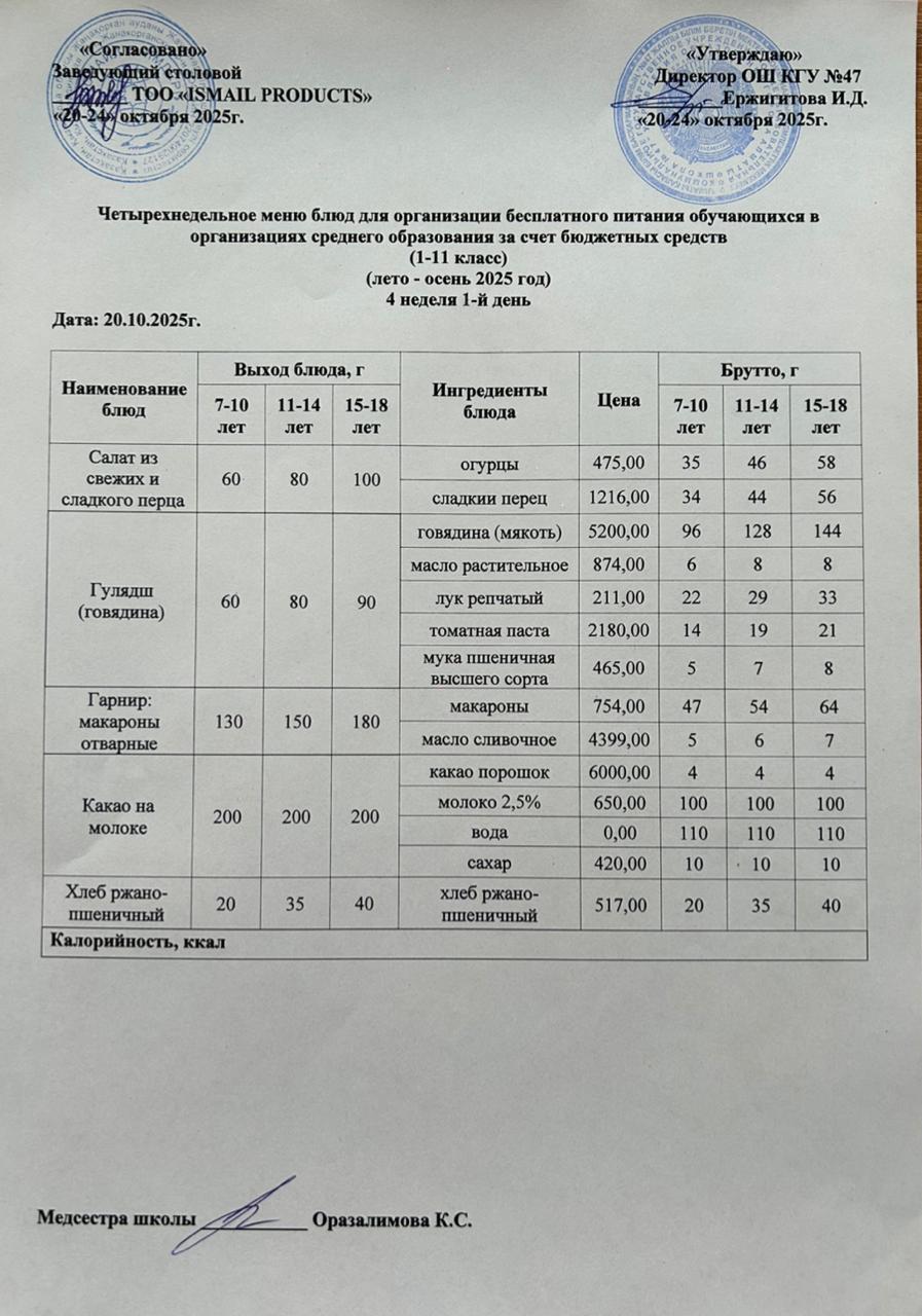 Бюджет қаражаты есебінен орта білім беру ұйымдарында білім алушыларды тегін тамақтандыруды ұйымдастыру үшін төрт апталық ас мәзірі/ Четырехнедельное меню блюд для организации бесплатного питания обучающихся в организациях среднего образования за счет бюджетных средств