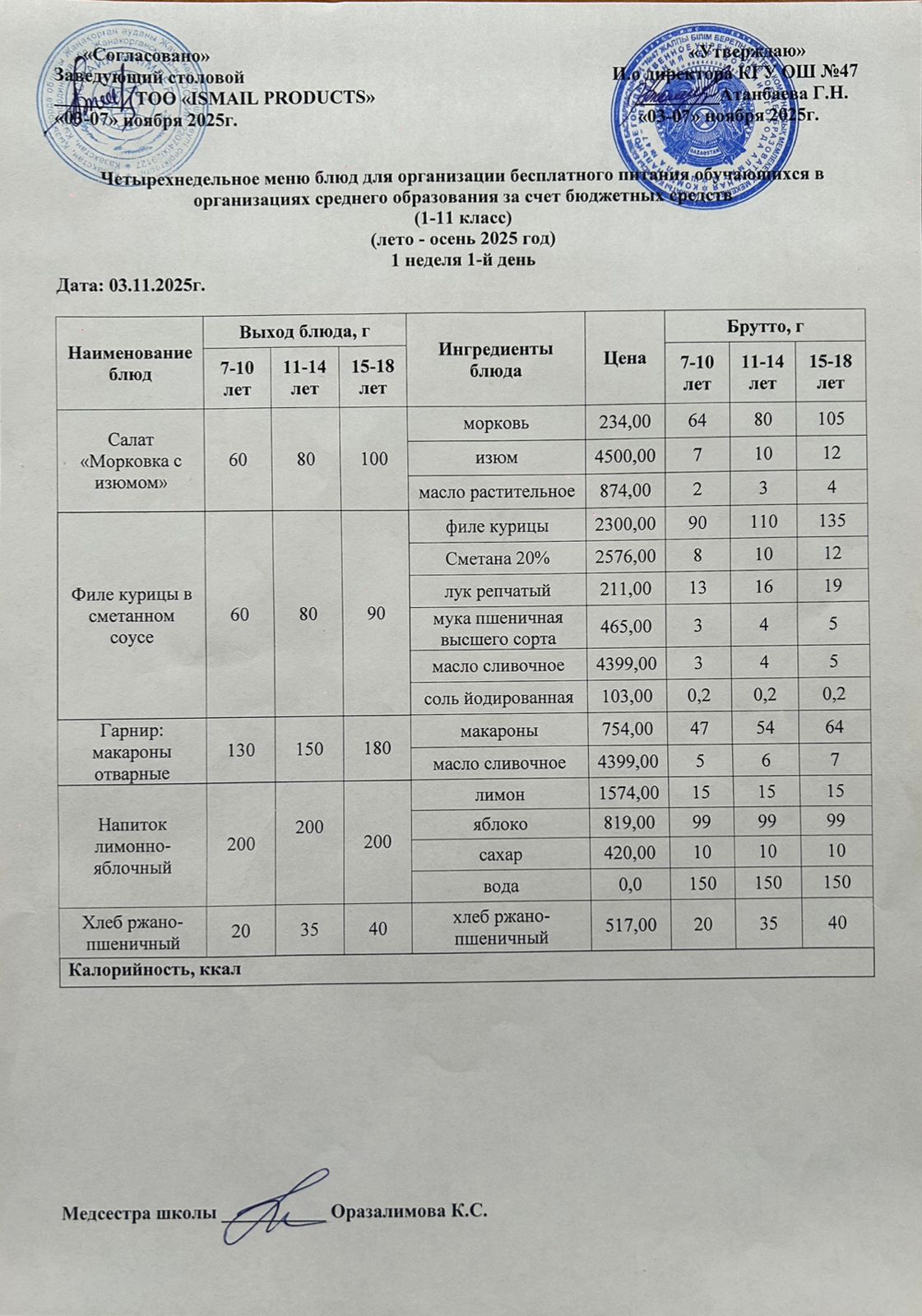 Бюджет қаражаты есебінен орта білім беру ұйымдарында білім алушыларды тегін тамақтандыруды ұйымдастыру үшін төрт апталық ас мәзірі/ Четырехнедельное меню блюд для организации бесплатного питания обучающихся в организациях среднего образования за счет бюджетных средств