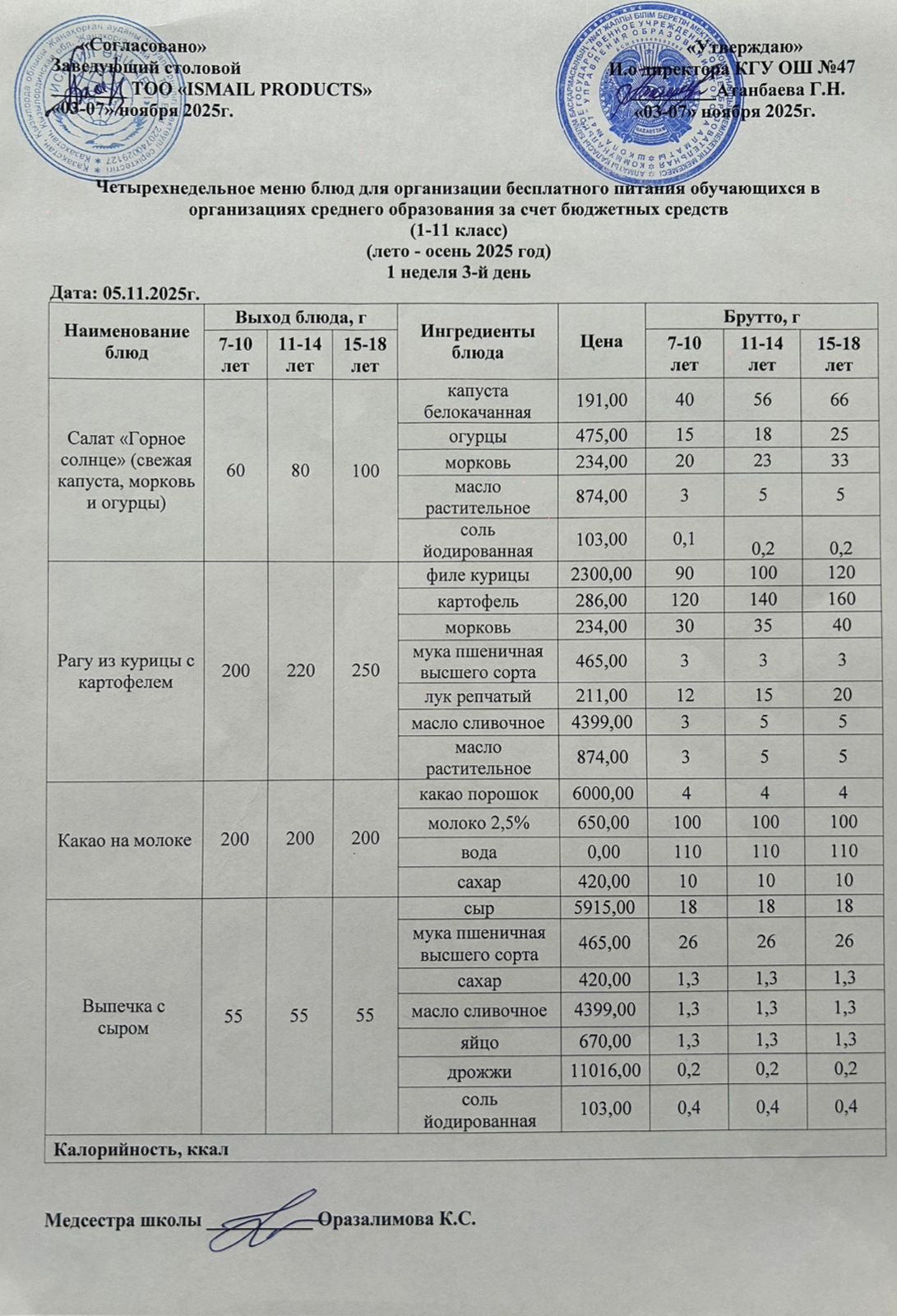 Бюджет қаражаты есебінен орта білім беру ұйымдарында білім алушыларды тегін тамақтандыруды ұйымдастыру үшін төрт апталық ас мәзірі/ Четырехнедельное меню блюд для организации бесплатного питания обучающихся в организациях среднего образования за счет бюджетных средств
