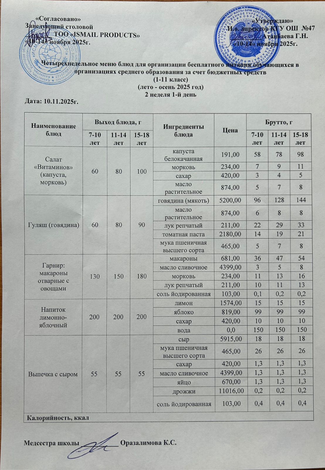 Бюджет қаражаты есебінен орта білім беру ұйымдарында білім алушыларды тегін тамақтандыруды ұйымдастыру үшін төрт апталық ас мәзірі/ Четырехнедельное меню блюд для организации бесплатного питания обучающихся в организациях среднего образования за счет бюджетных средств
