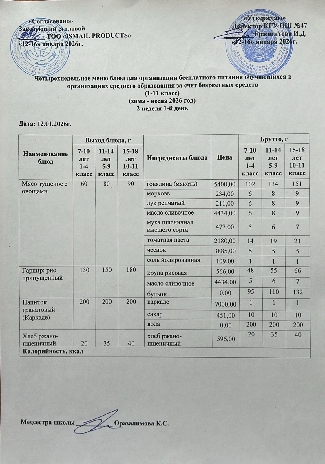 Бюджет қаражаты есебінен орта білім беру ұйымдарында білім алушыларды тегін тамақтандыруды ұйымдастыру үшін төрт апталық ас мәзірі/ Четырехнедельное меню блюд для организации бесплатного питания обучающихся в организациях среднего образования за счет бюджетных средств