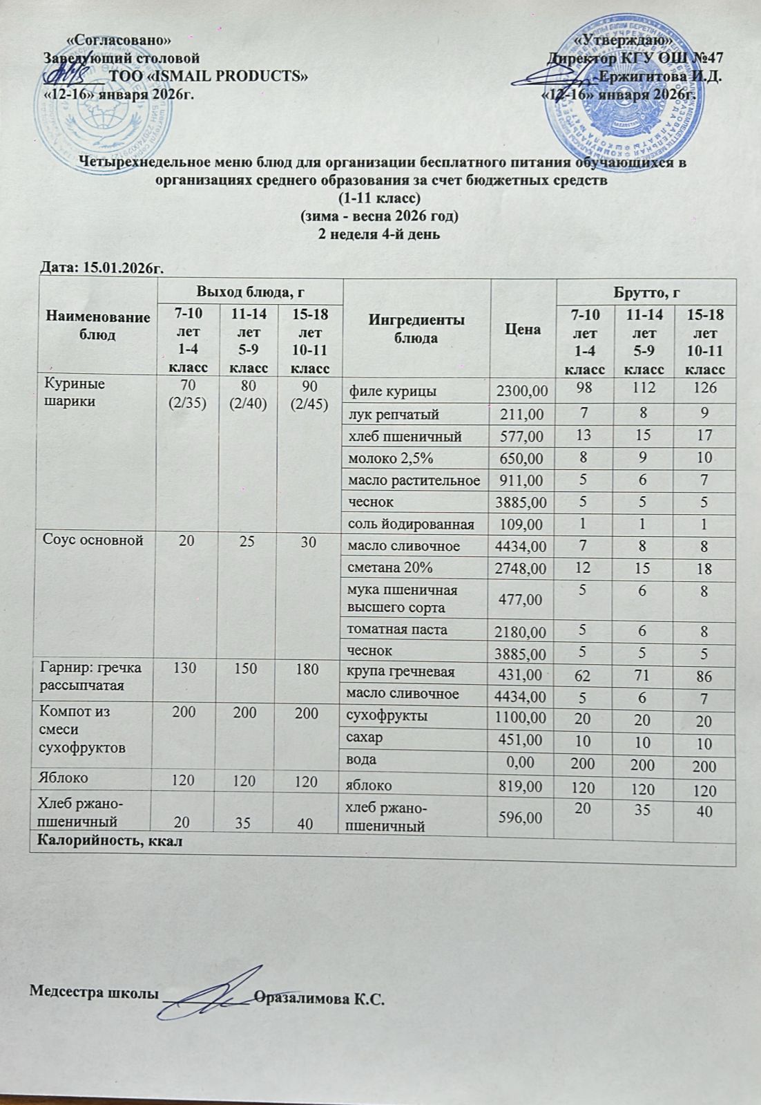 Бюджет қаражаты есебінен орта білім беру ұйымдарында білім алушыларды тегін тамақтандыруды ұйымдастыру үшін төрт апталық ас мәзірі/ Четырехнедельное меню блюд для организации бесплатного питания обучающихся в организациях среднего образования за счет бюджетных средств