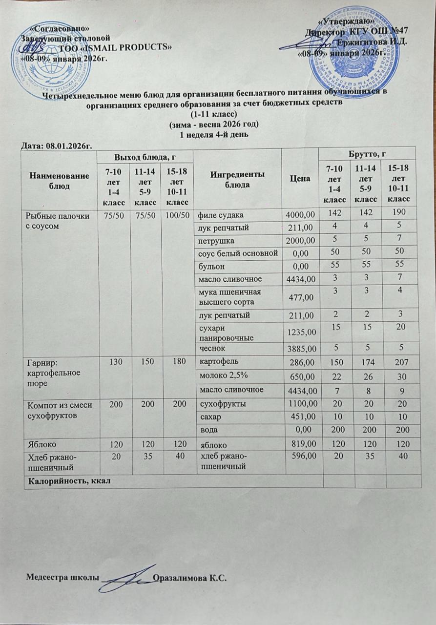 Бюджет қаражаты есебінен орта білім беру ұйымдарында білім алушыларды тегін тамақтандыруды ұйымдастыру үшін төрт апталық ас мәзірі/ Четырехнедельное меню блюд для организации бесплатного питания обучающихся в организациях среднего образования за счет бюджетных средств
