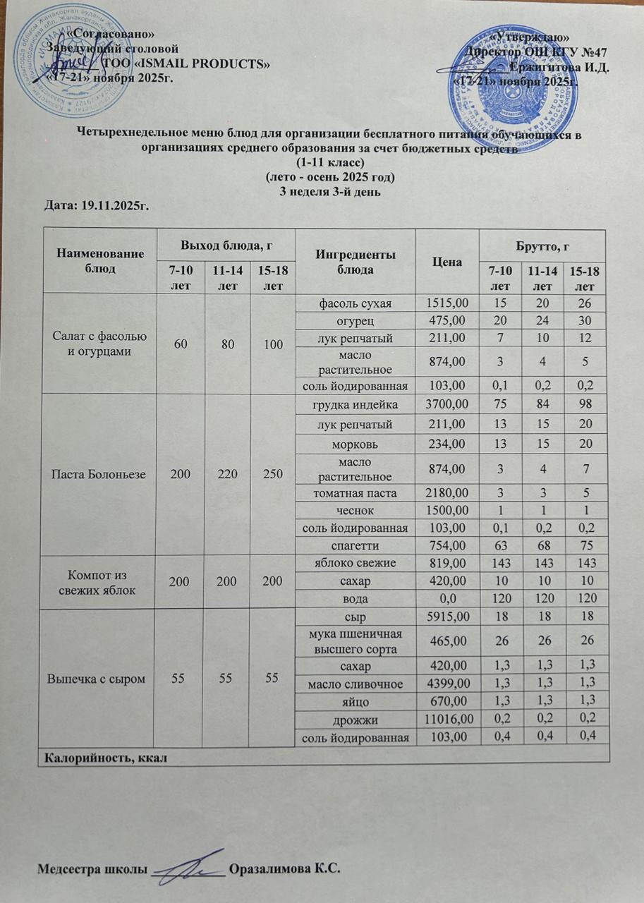 Бюджет қаражаты есебінен орта білім беру ұйымдарында білім алушыларды тегін тамақтандыруды ұйымдастыру үшін төрт апталық ас мәзірі/ Четырехнедельное меню блюд для организации бесплатного питания обучающихся в организациях среднего образования за счет бюджетных средств