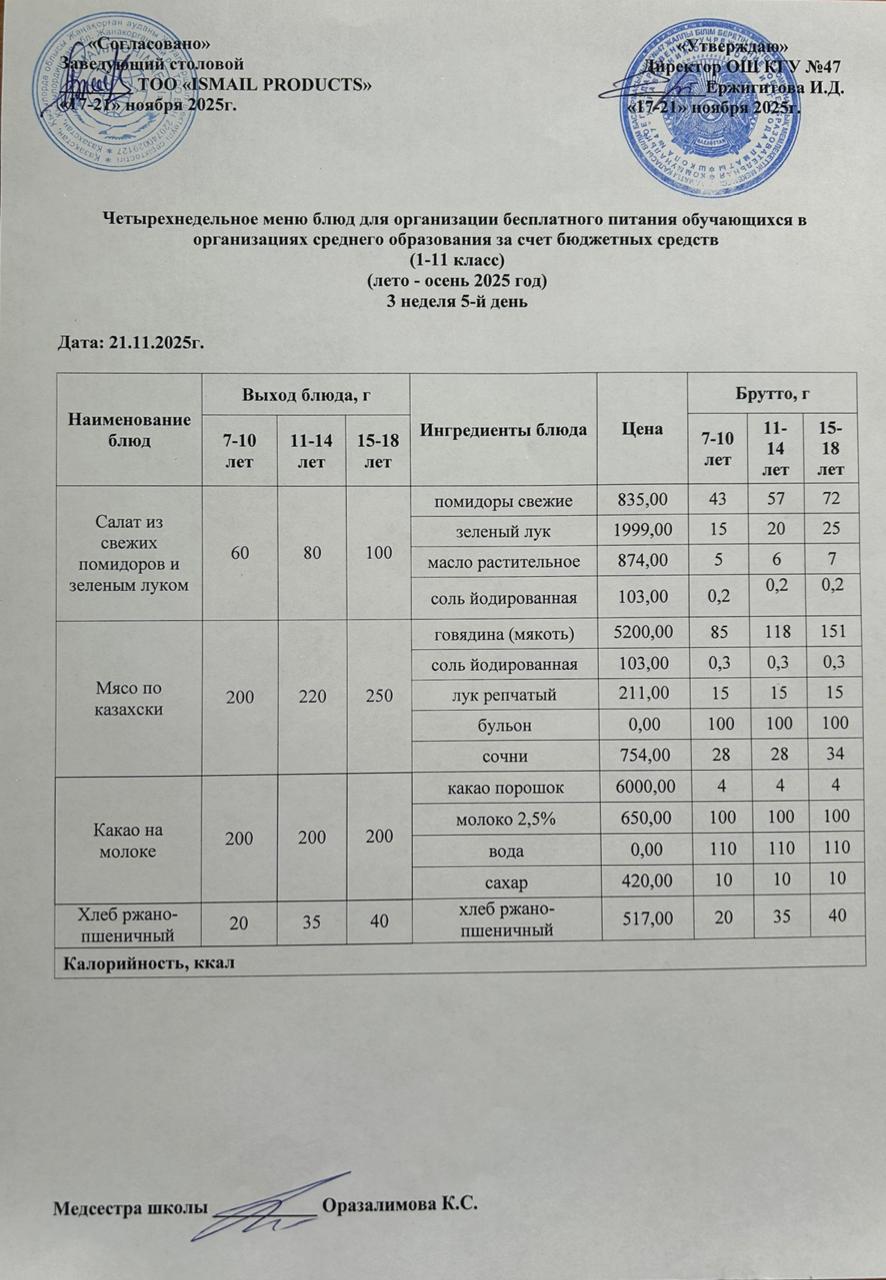 Бюджет қаражаты есебінен орта білім беру ұйымдарында білім алушыларды тегін тамақтандыруды ұйымдастыру үшін төрт апталық ас мәзірі/ Четырехнедельное меню блюд для организации бесплатного питания обучающихся в организациях среднего образования за счет бюджетных средств