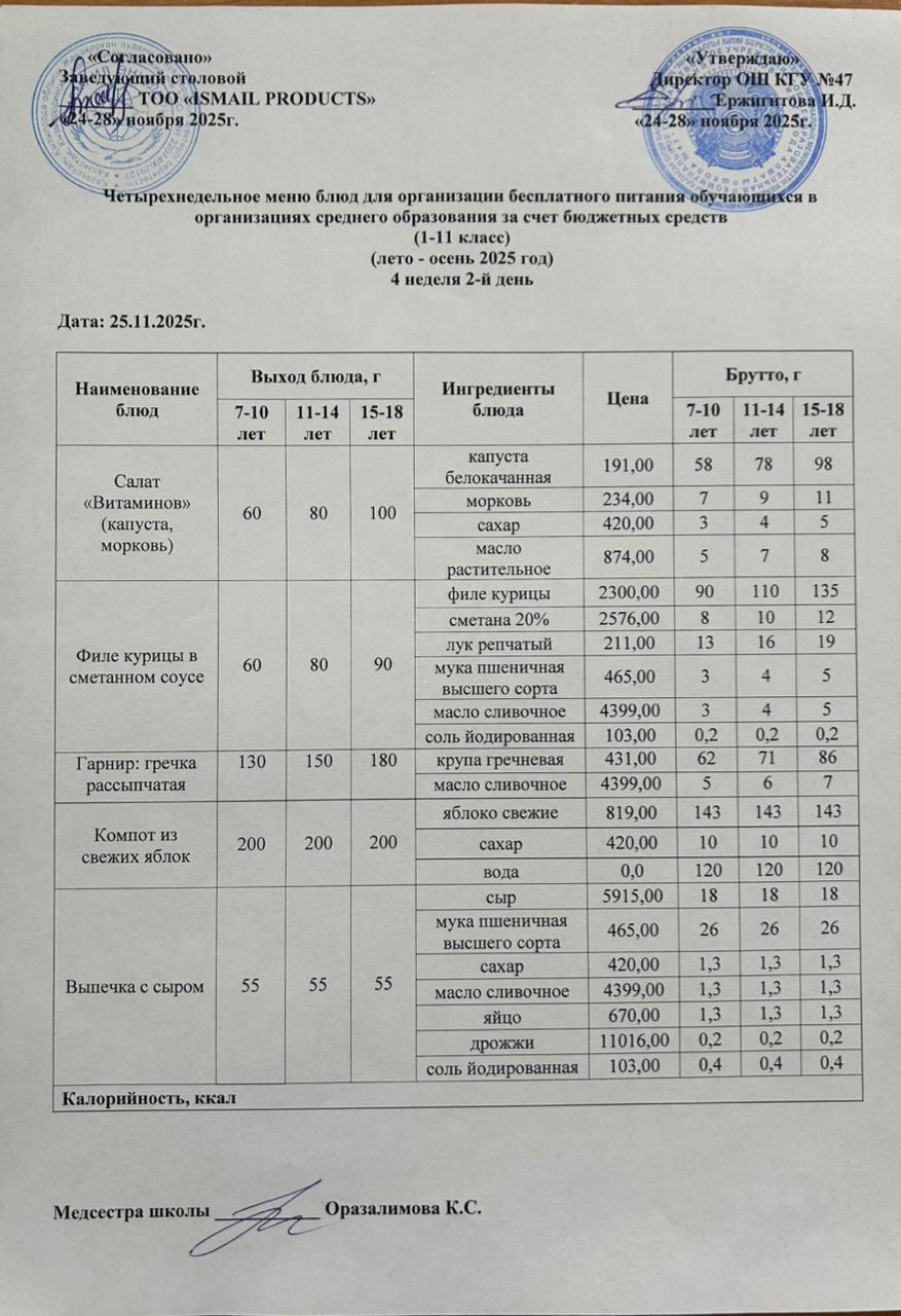 Бюджет қаражаты есебінен орта білім беру ұйымдарында білім алушыларды тегін тамақтандыруды ұйымдастыру үшін төрт апталық ас мәзірі/ Четырехнедельное меню блюд для организации бесплатного питания обучающихся в организациях среднего образования за счет бюджетных средств