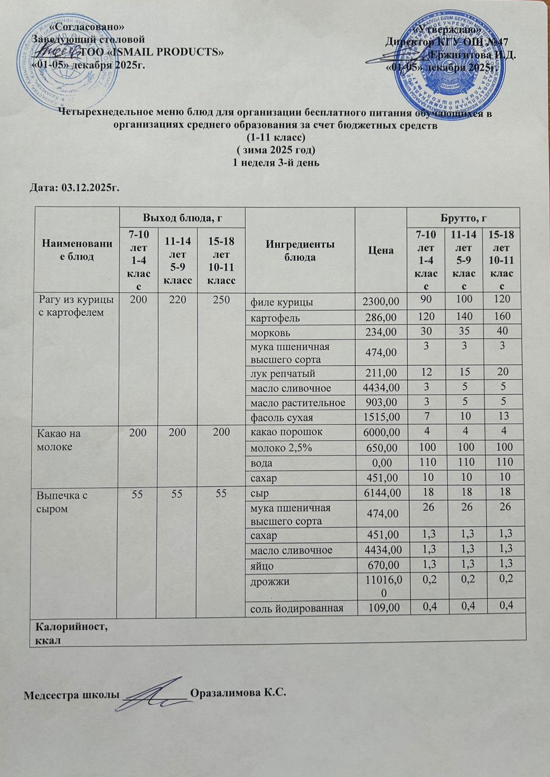 Бюджет қаражаты есебінен орта білім беру ұйымдарында білім алушыларды тегін тамақтандыруды ұйымдастыру үшін төрт апталық ас мәзірі/ Четырехнедельное меню блюд для организации бесплатного питания обучающихся в организациях среднего образования за счет бюджетных средств