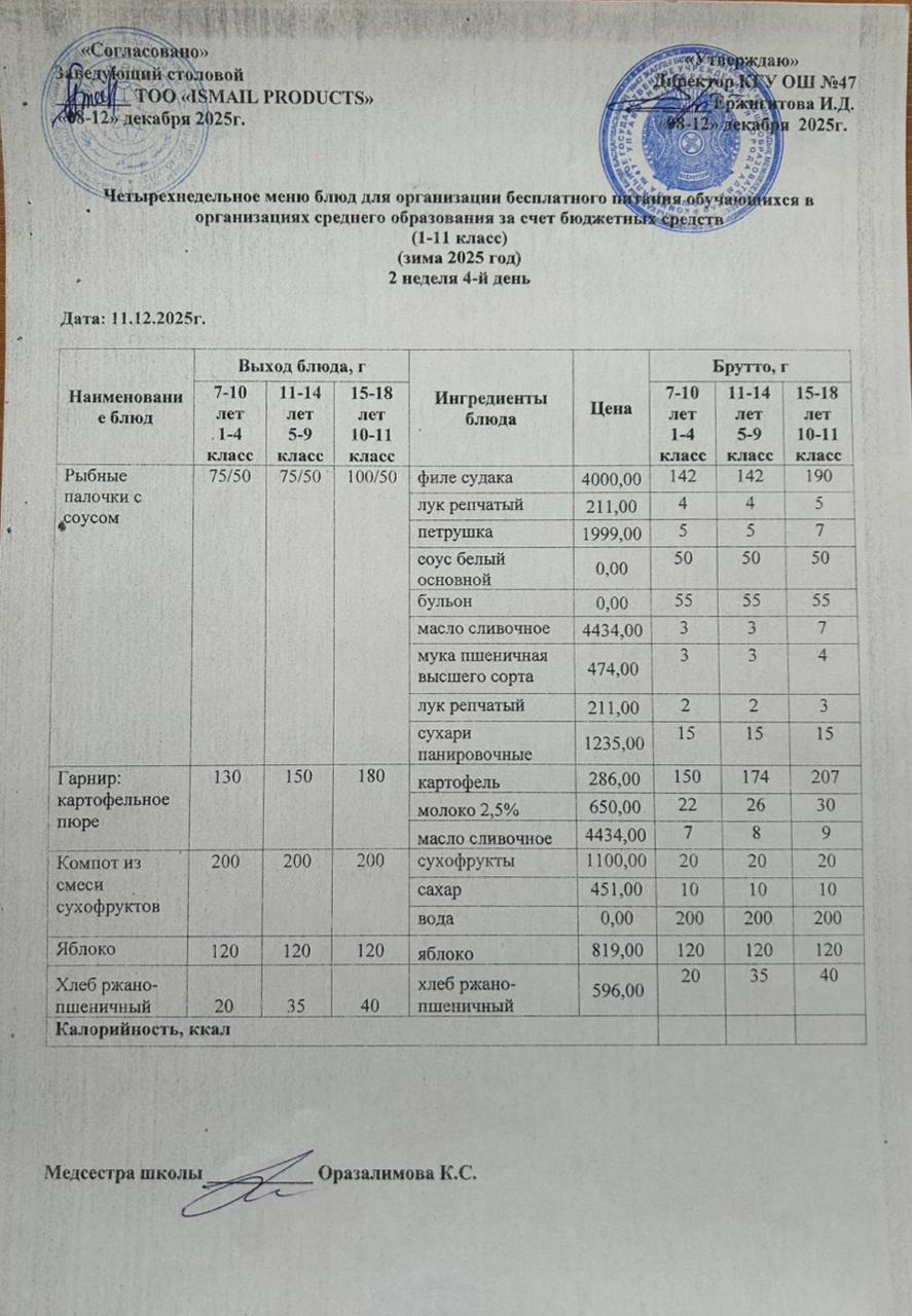 Бюджет қаражаты есебінен орта білім беру ұйымдарында білім алушыларды тегін тамақтандыруды ұйымдастыру үшін төрт апталық ас мәзірі/ Четырехнедельное меню блюд для организации бесплатного питания обучающихся в организациях среднего образования за счет бюджетных средств